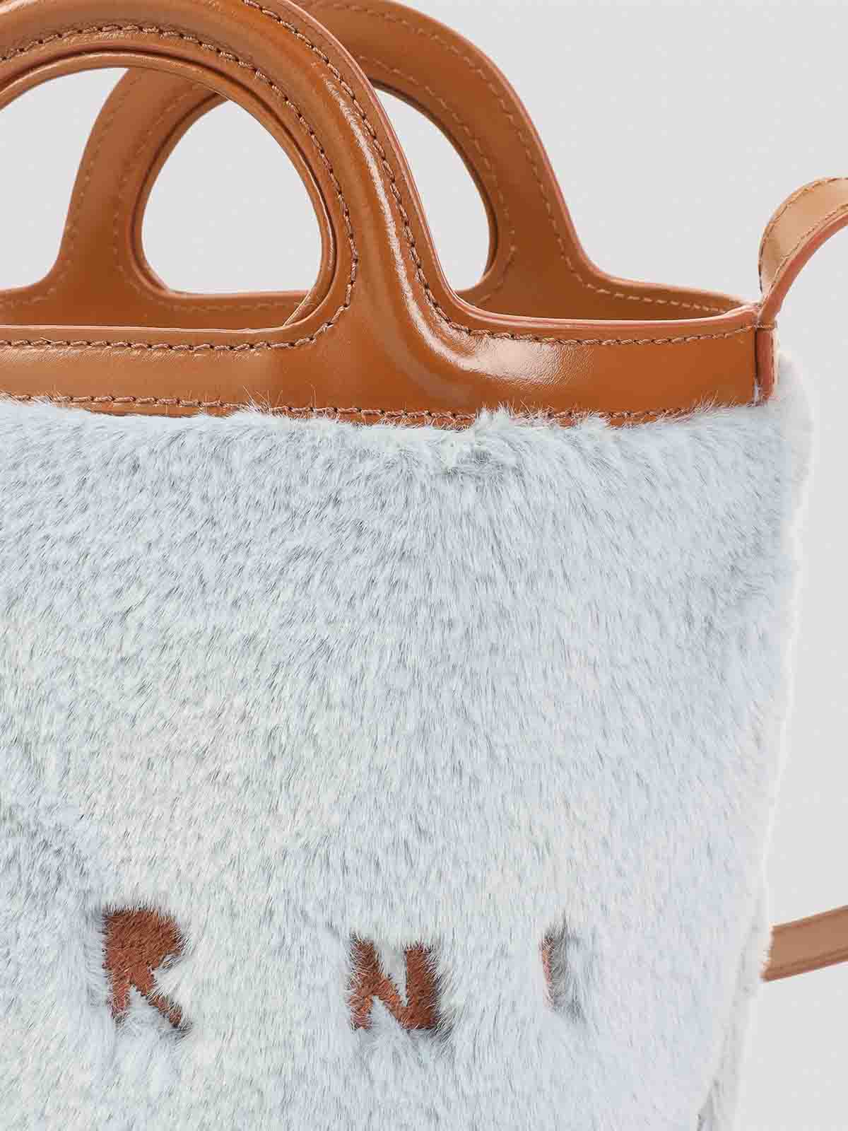 Bolso de mano Marni Tropicalia de color azul claro confeccionado en marrón y azul claro, asas superiores artificiales, exclusivo cordón, correa de hombro larga y ajustable, bolsillo con cremallera