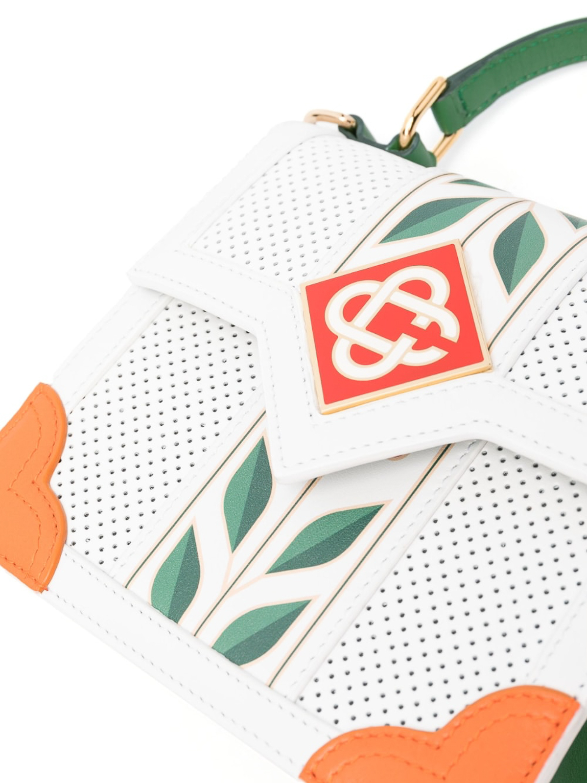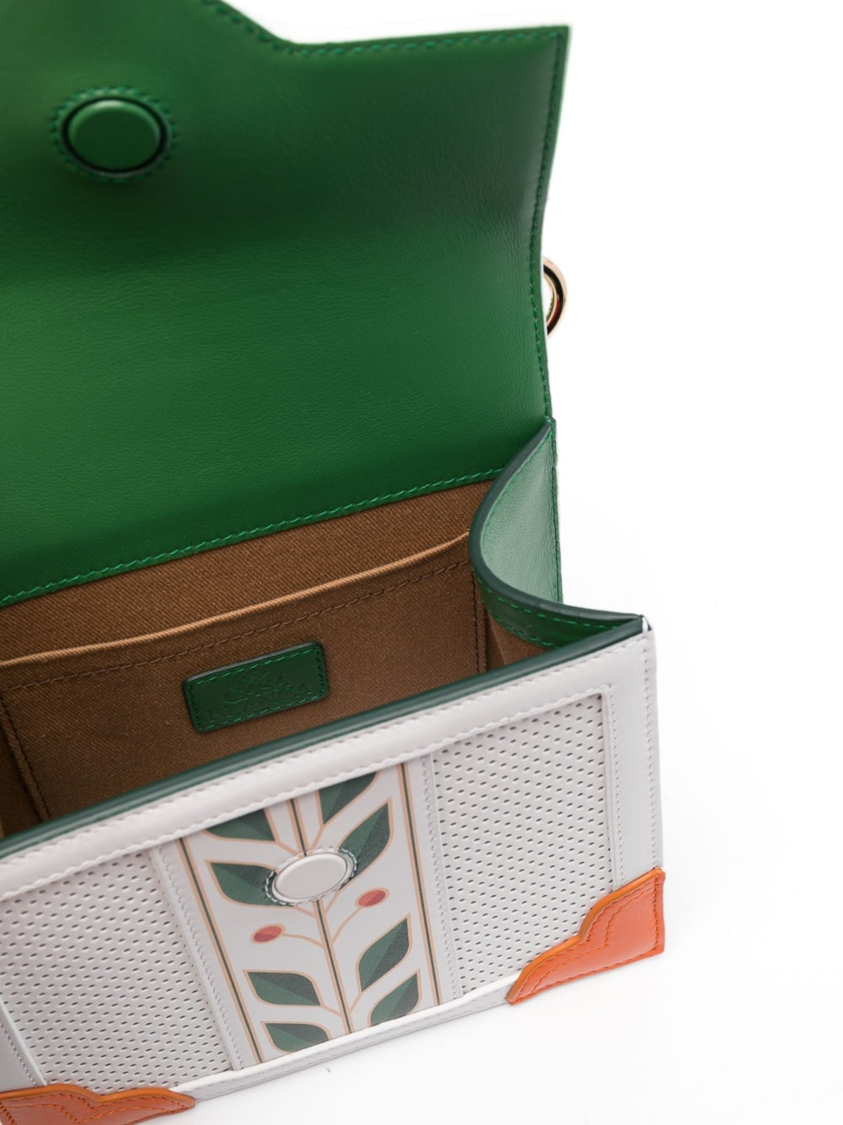 minibolso Jeanne de Casablanca con piel de becerro blanca/multicolor, detalles perforados, logotipo estampado en la parte delantera, parte superior plegable con cierre magnético, asa superior única, correa de hombro desmontable y ranura interna para tarjetas.