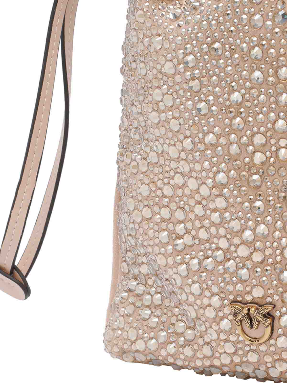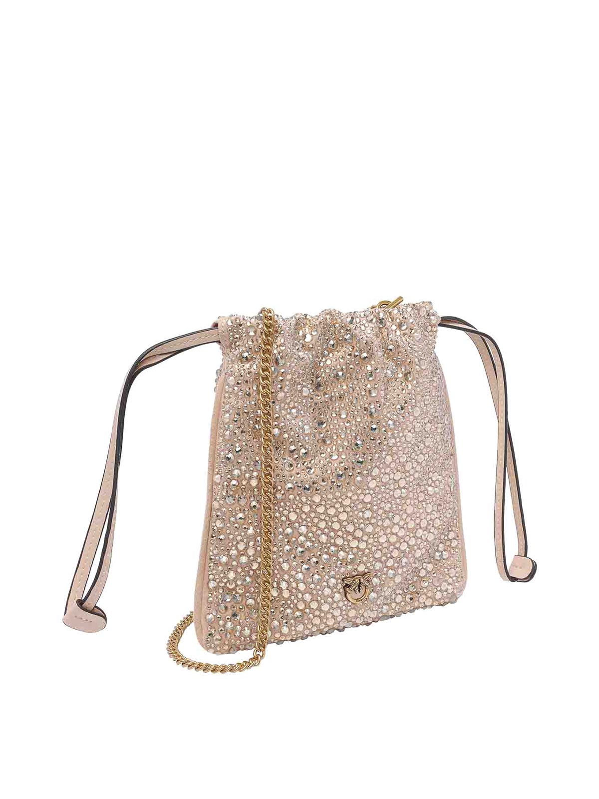 Bolso de mano holgado para bebé de color rosa marfil, cierre en forma de coulisse, bolsillo interior con cremallera, correa de cadena extraíble, strass en toda la prenda