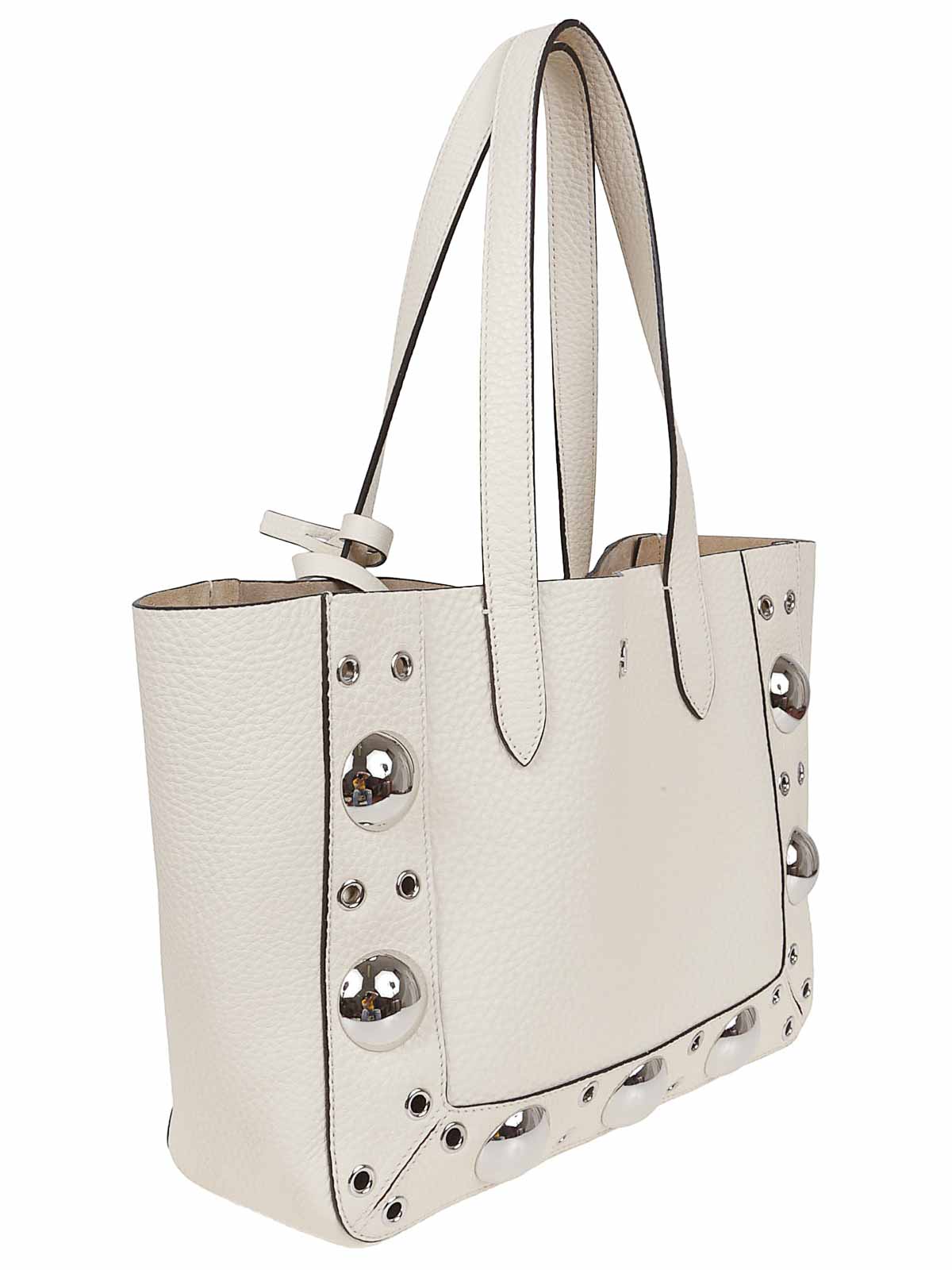 Adornos blancos con tachuelas esféricas, detalles perforados, dos asas superiores y firma con el logotipo en V.