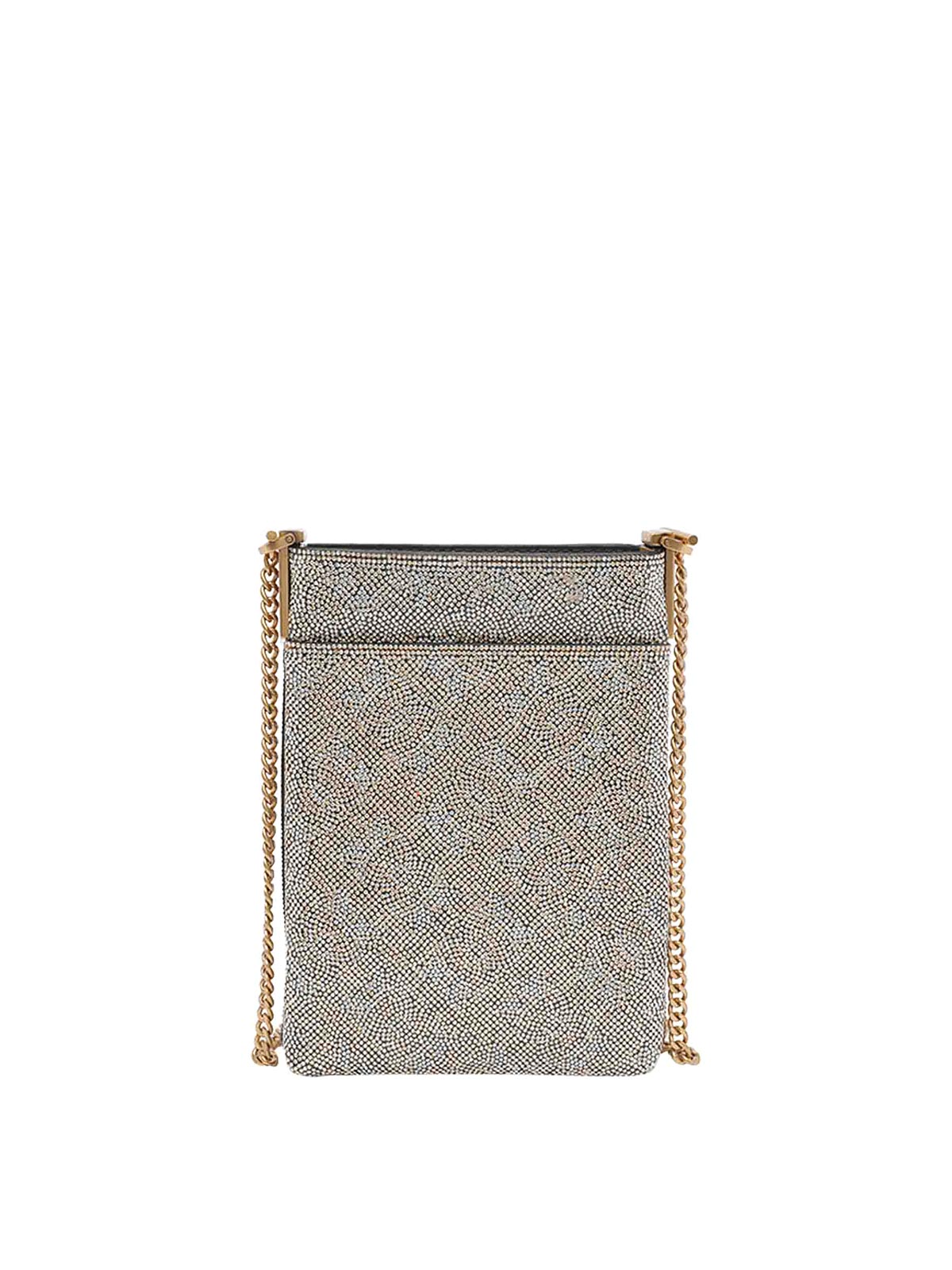 Funda de teléfono con monograma de strass dorado rosa, bolsillo externo, correa de cadena extraíble, strass en toda la prenda