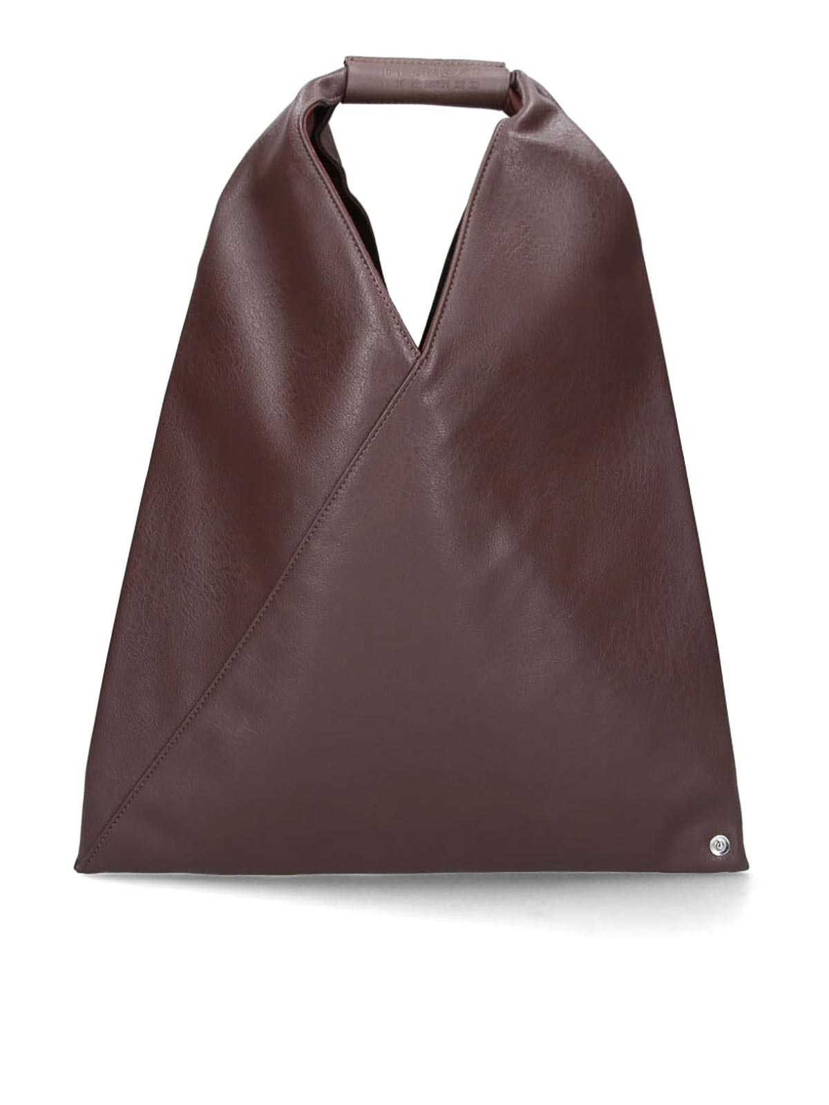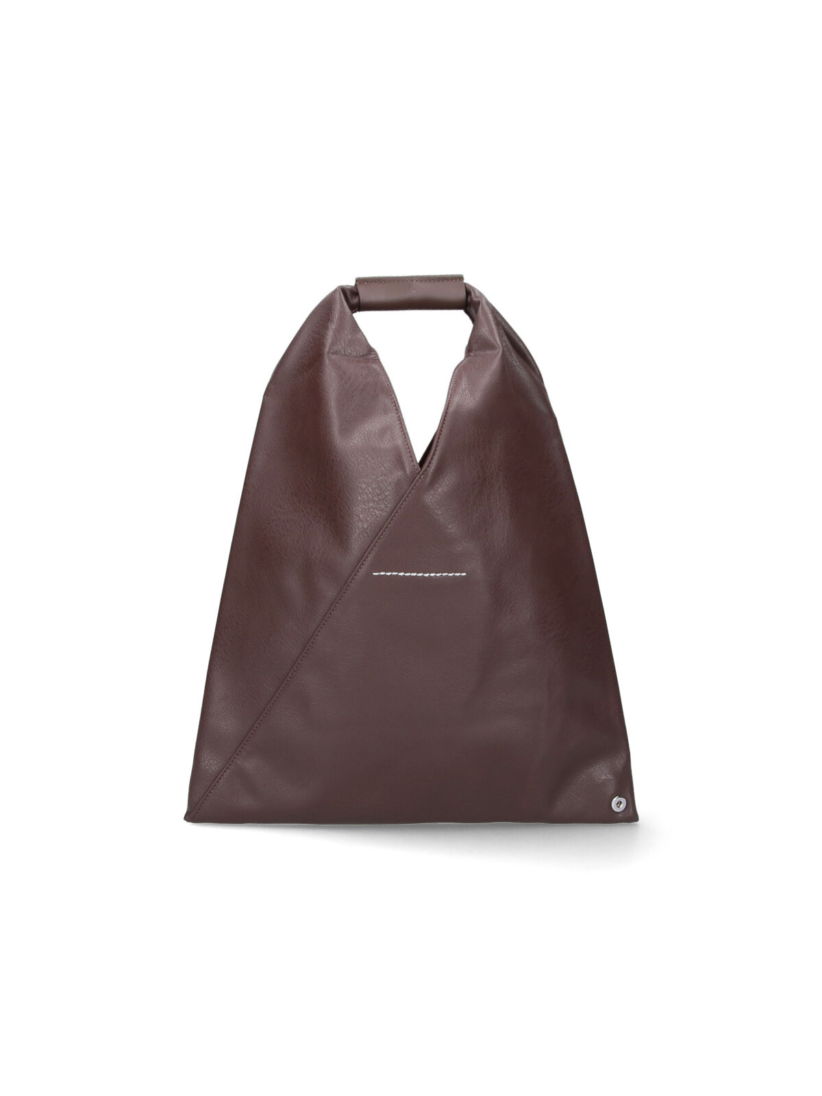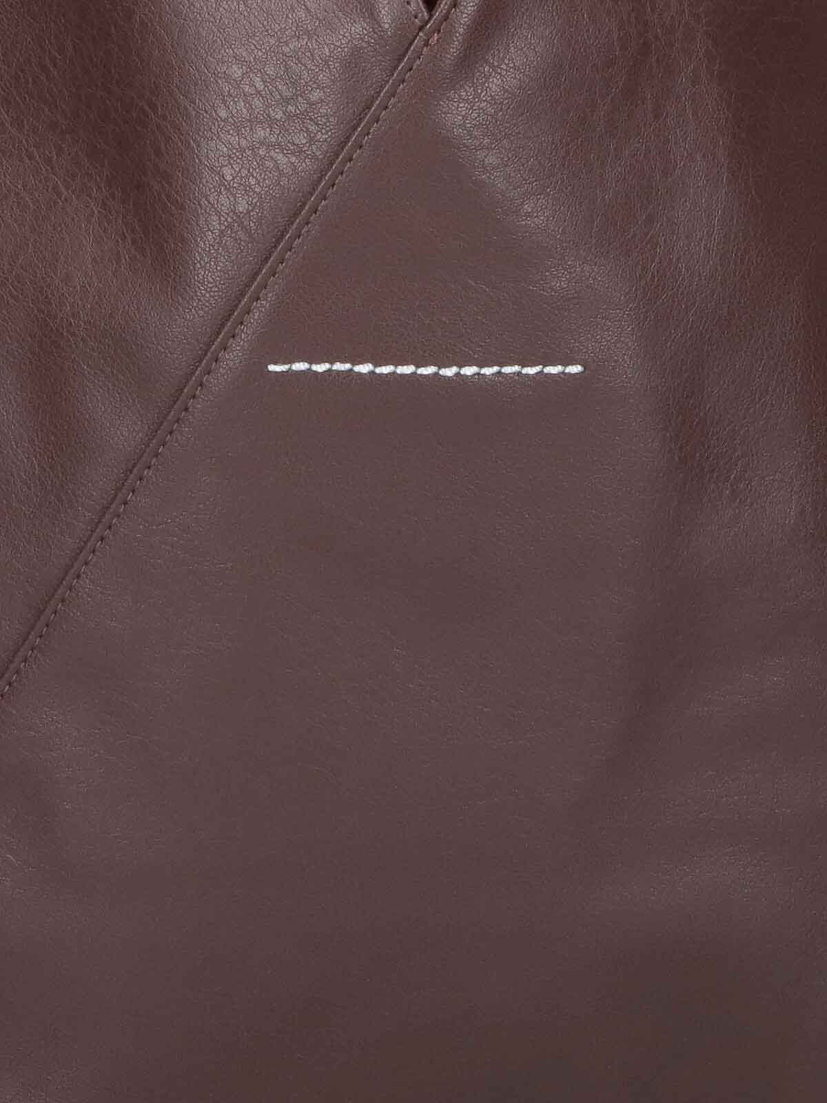 Bolso japonés mediano MM6 de Maison Margiela, en piel ecológica marrón, tono oscuro, acabados en piel, asa, detalle de logotipo numérico en relieve, costuras en contraste en la parte posterior, un bolsillo interno con solapa con botones y dos compartimentos internos separados.