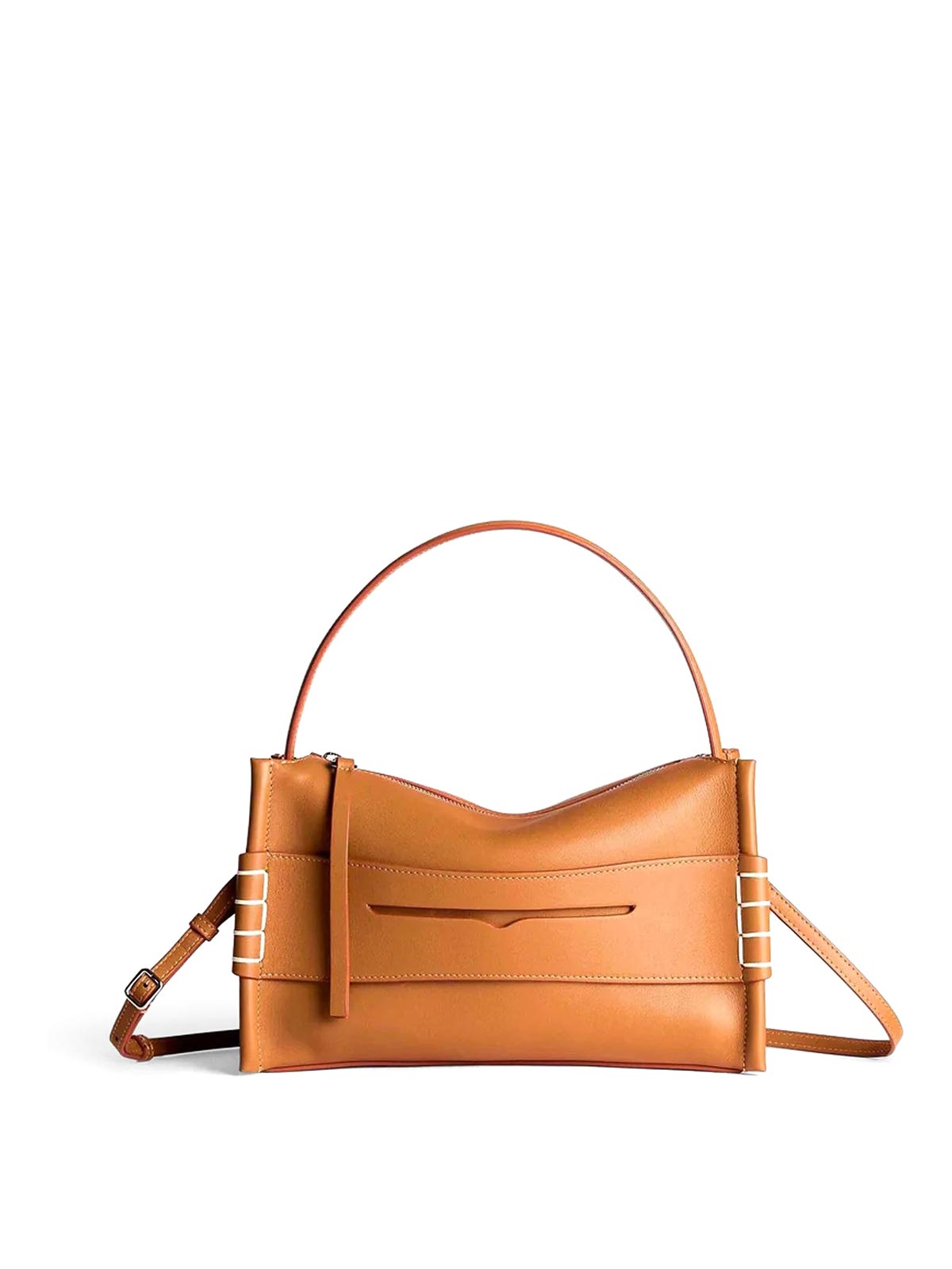 Mocasín pequeño de piel marrón, mocasín de suave piel de becerro de color tostado, silueta compacta, con asa superior y correa de hombro extraíble, detalles plateados, la base reproduce la suela de un mocasín, logotipo estampado, 100% piel, color: marrón