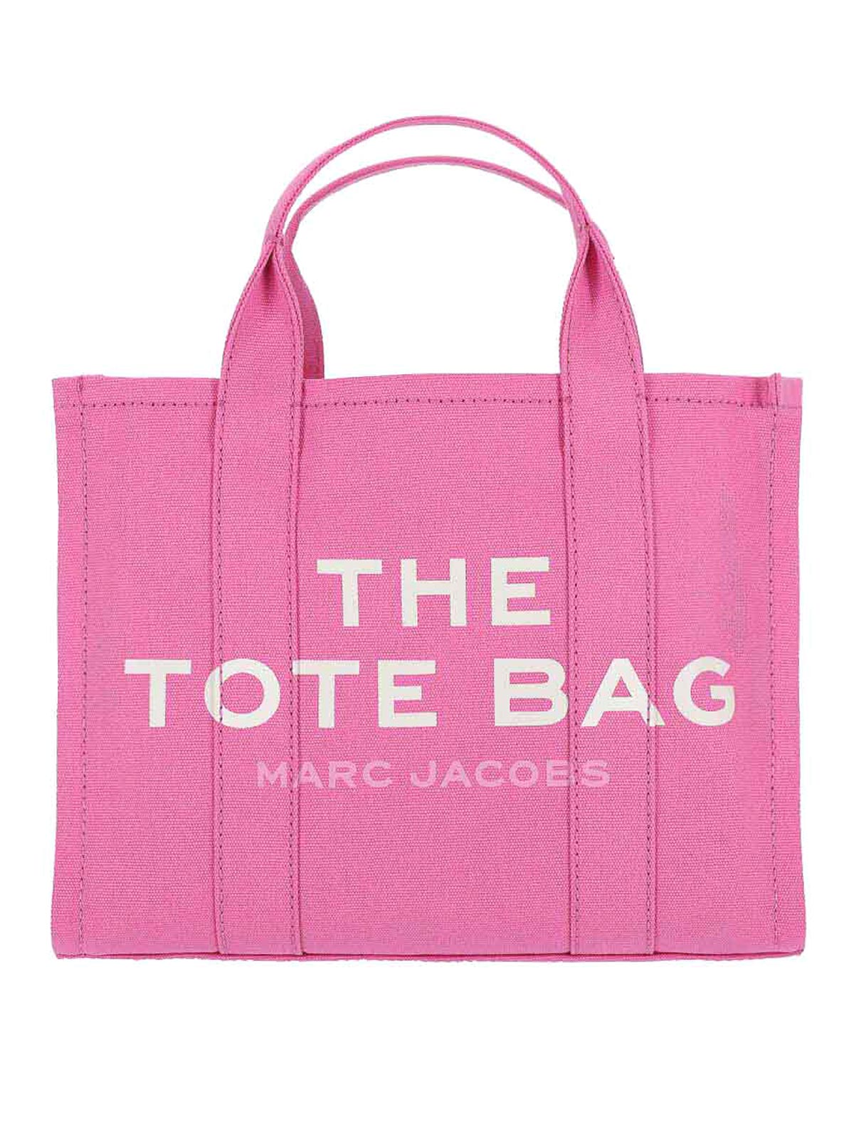 El bolso Canvas Media Tote Bag Marc Jacobs, de algodón rosa, tonalidad transparente, dos asas, correa de hombro ajustable y extraíble, cierre con cremallera, estampado de logotipo blanco en la parte delantera, correa lateral, parche con el logotipo retro, dos bolsillos internos planos, un bolsillo interno con cremallera y un compartimento interno principal.