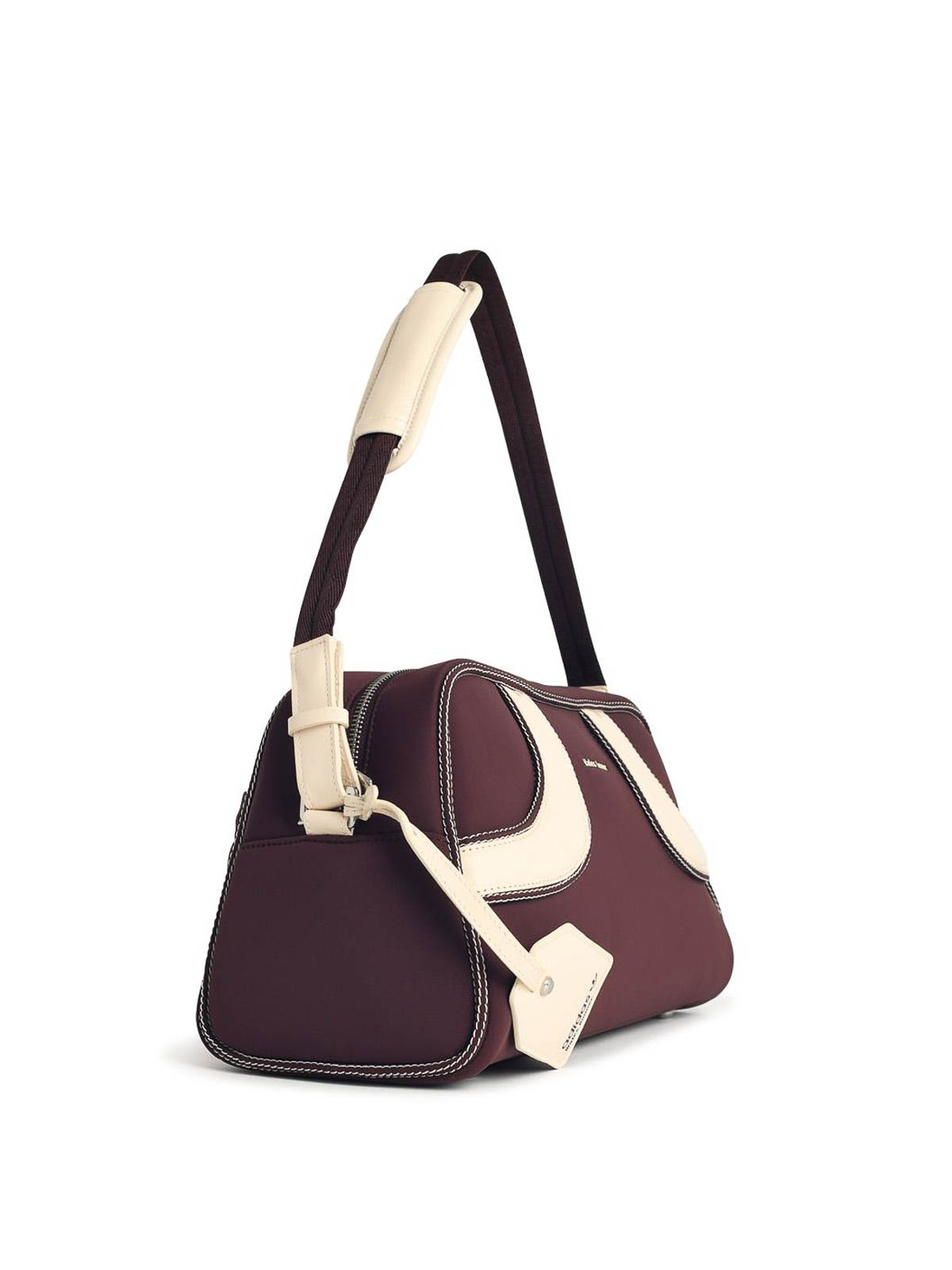 Bandolera de velcro ligeramente ajustable, inserto deslizante acolchado en la correa, detalles de piel en contraste, logotipo en la parte delantera y trasera en contraste, cierre con cremallera doble deslizante, compartimento principal grande, bolsillo interior con cremallera, bolsillo trasero con cordón, patas metálicas en la parte inferior\n36 x 20 x 17 cm