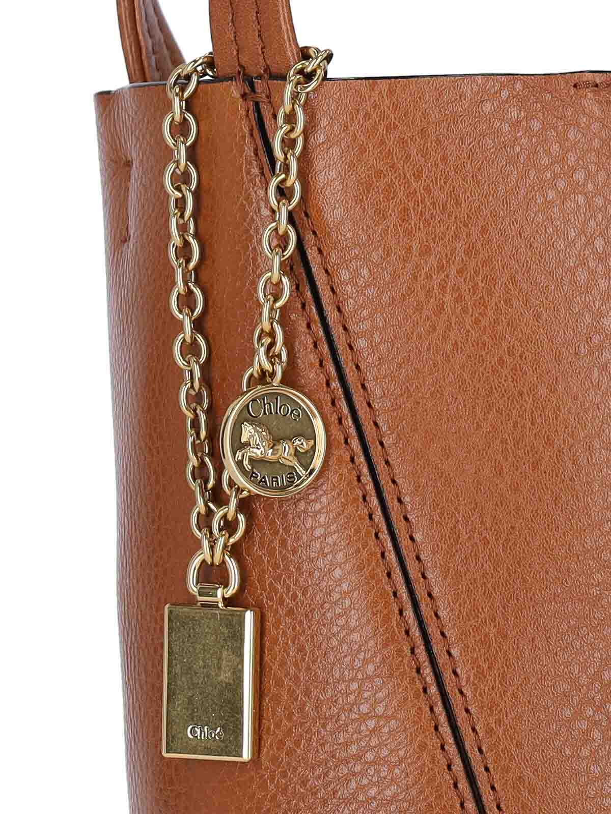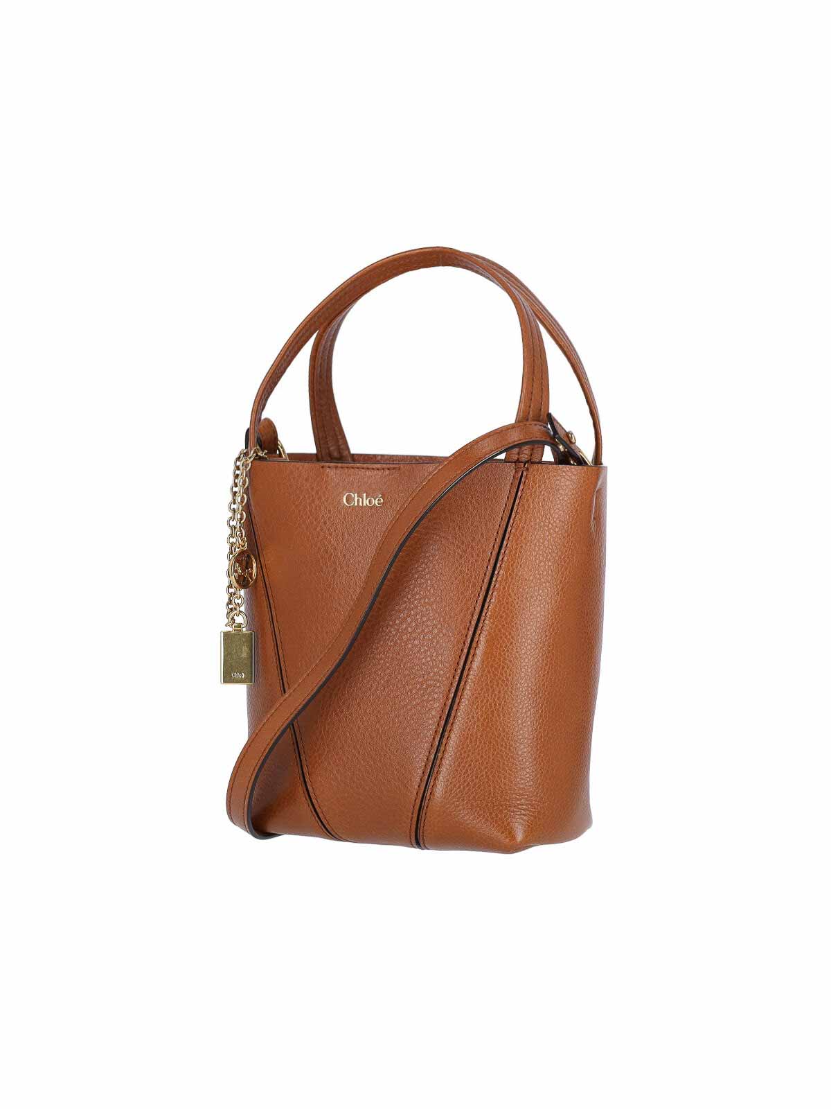 Bolso giratorio pequeño, en piel martillada marrón, dos asas ajustables con anillo de metal dorado, detalle de cadena extraíble en metal dorado con colgante, correa de hombro ajustable y extraíble, cierre magnético, estampado del logotipo dorado y un compartimento interno único.