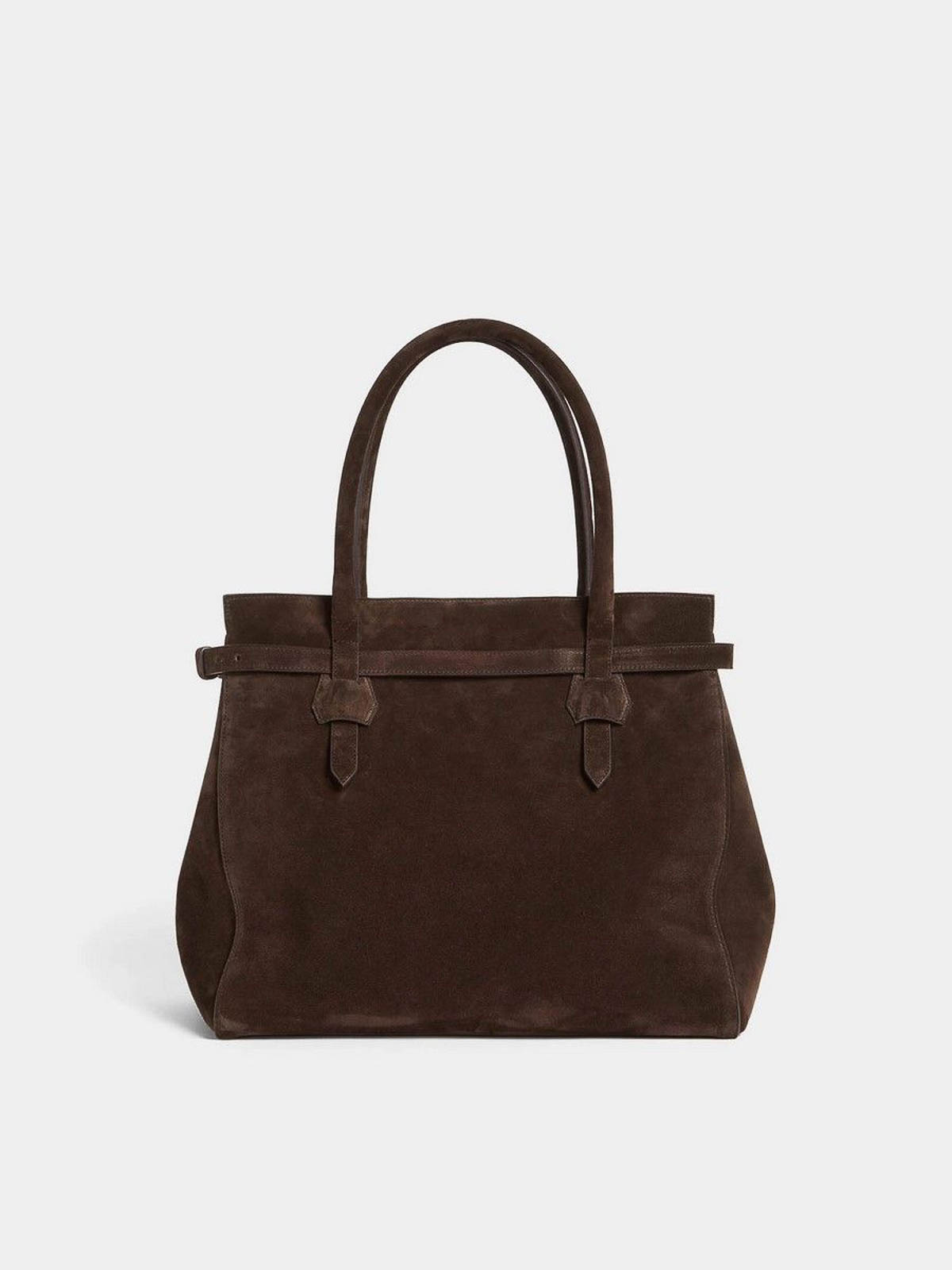 Bolsa de compras doble Dsquared2 de gamuza, cierre con botón magnético, asas tubulares y bolsillo interno con cremallera.