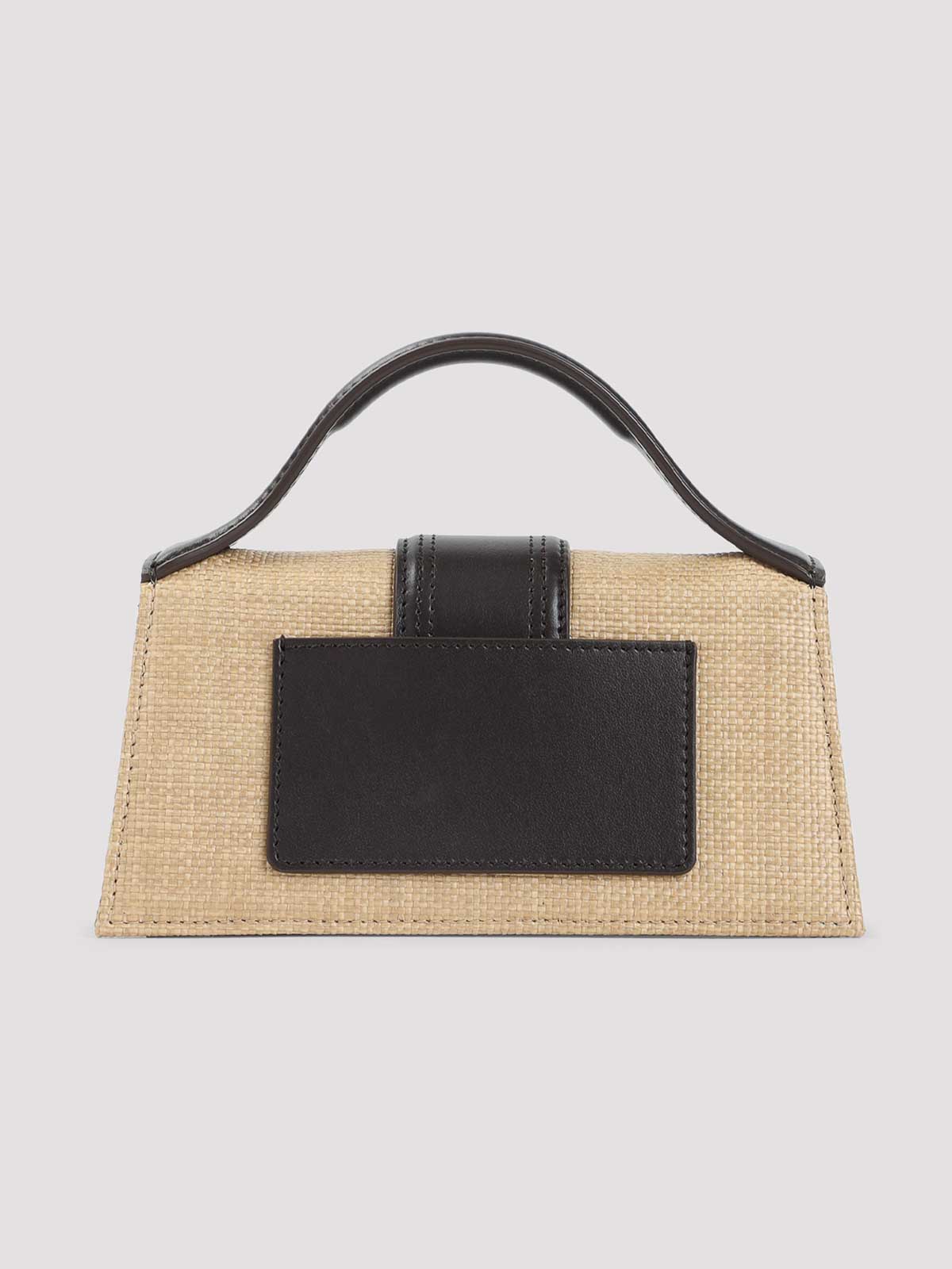 Bolso Jacquemus de rafia le bambino de color beige natural. Bolso de rafia beige natural, asa de piel marrón oscuro en contraste en la parte superior, cierre con solapa frontal, correa de cuero marrón oscuro con solapa delantera, logotipo lateral con letras metálicas en tono dorado, correa de hombro de piel marrón oscuro ajustable y desmontable. Herrajes dorados.