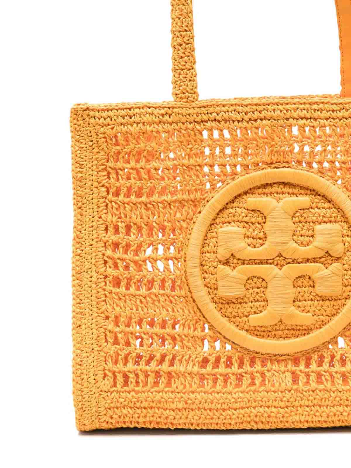 Modelo con tapa abierta, dos asas, distintivo motivo de doble T, rafia pajizada, acabado en piel sintética, asas superiores tejidas a ganchillo de 23,5 cm. tejidas a ganchillo a mano.