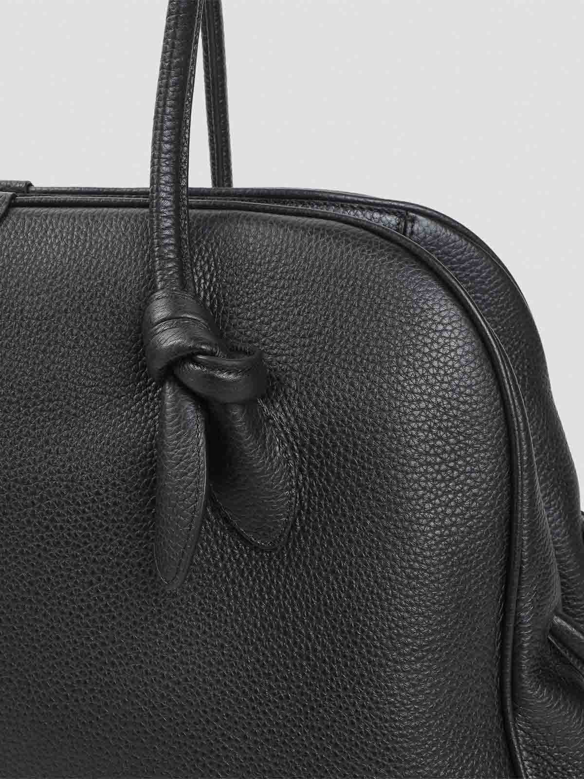 Bolso de mano negro granulado Jacquemus le grand turismo confeccionado con asas superiores graneadas negras con lazo, bolsillo de parche con cremallera bidireccional y bolsillo con cremallera forrado