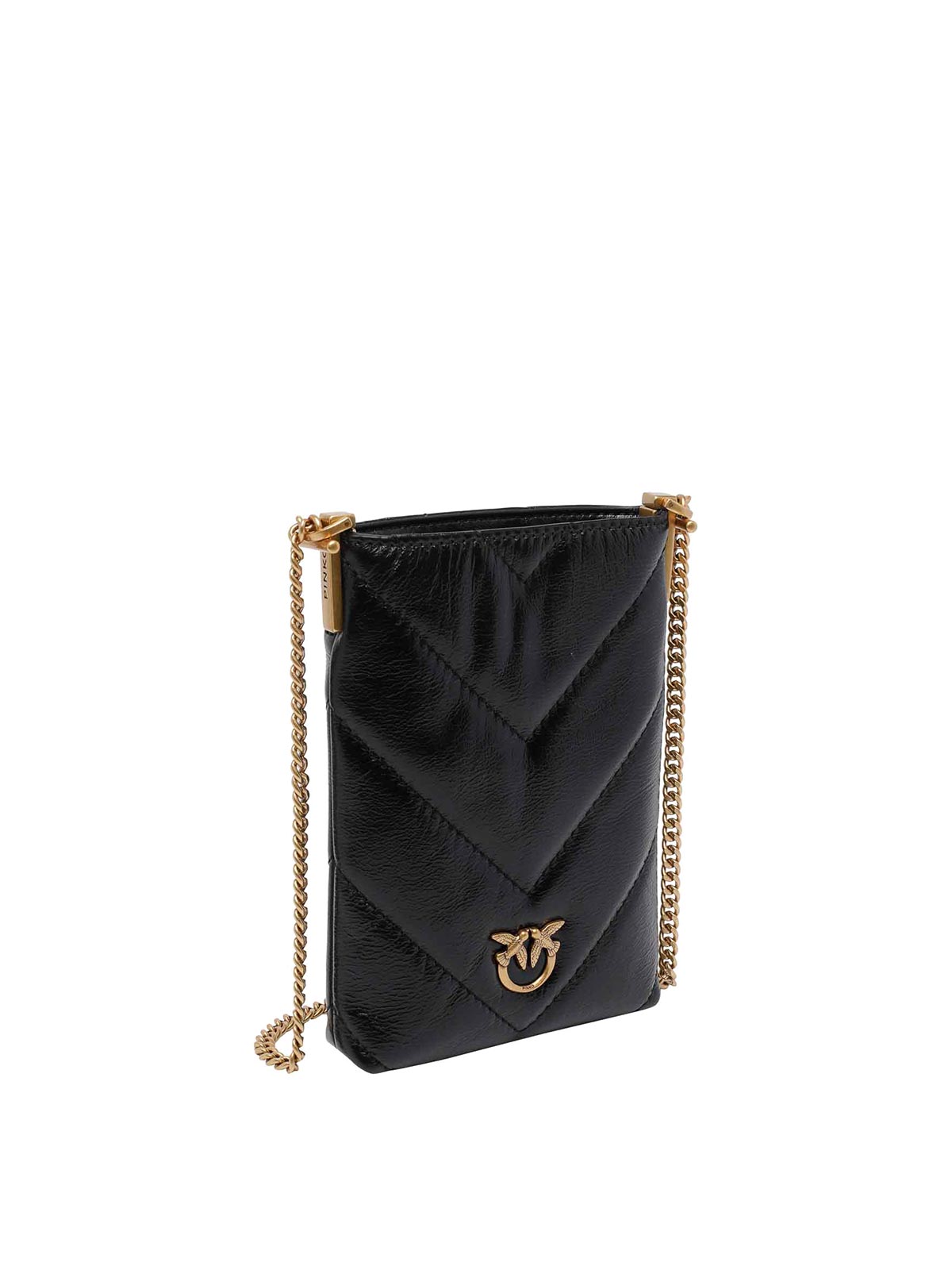 Funda de teléfono con monograma en negro rosado, bolsillo externo, correa de cadena extraíble, strass en toda la prenda