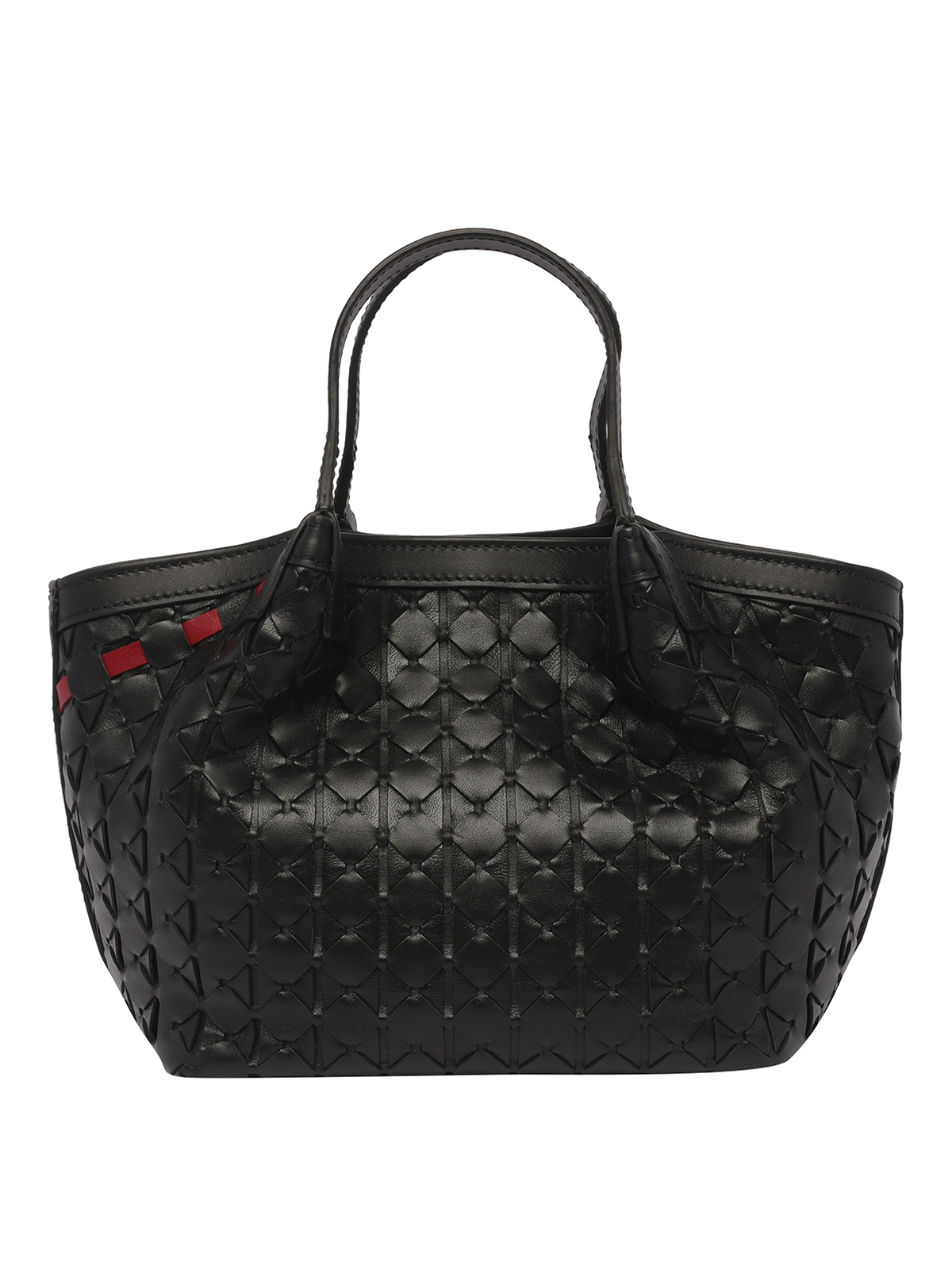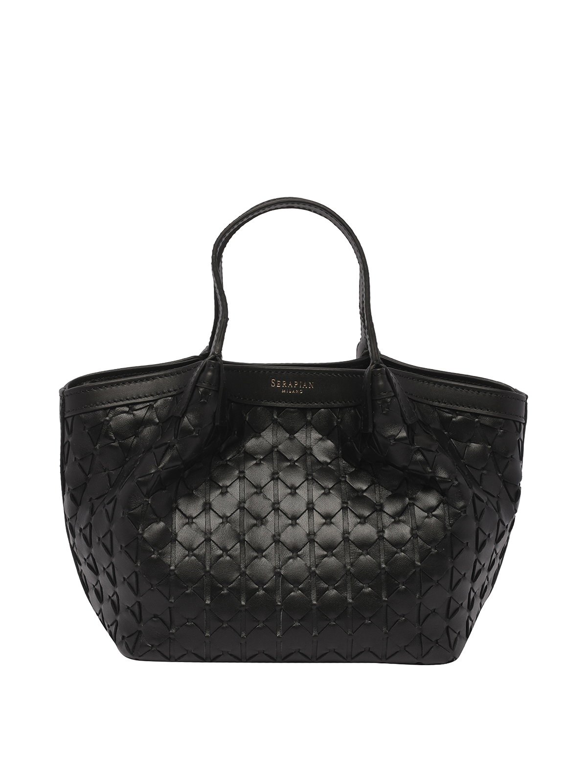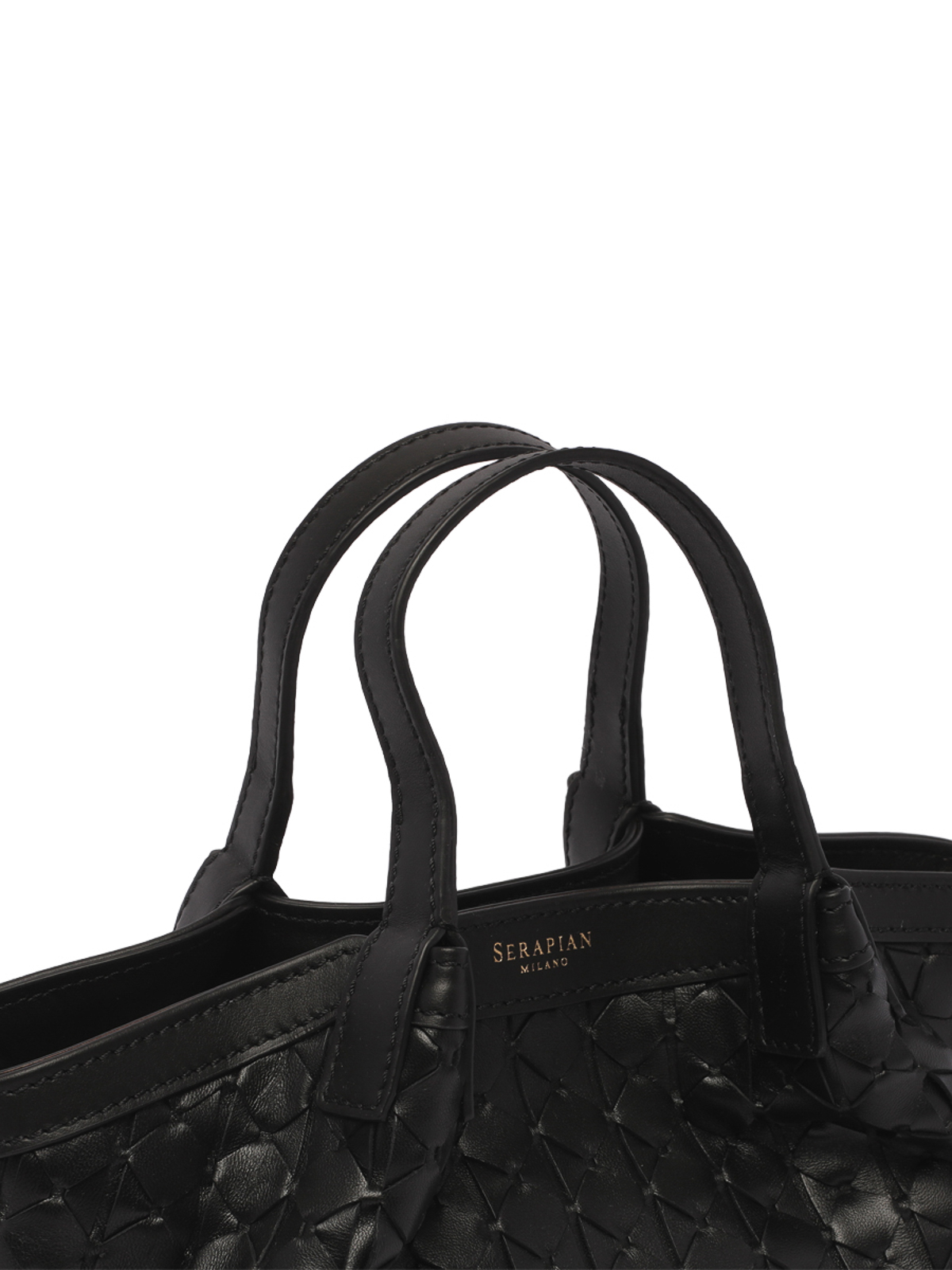 Bolso de mano Serapian en forma de mosaico secreto negro con cierre magnético, dos compartimentos, dos bolsillos con cremallera y un bolsillo abierto en el interior, doble asa, correa de hombro ajustable y desmontable, logotipo frontal