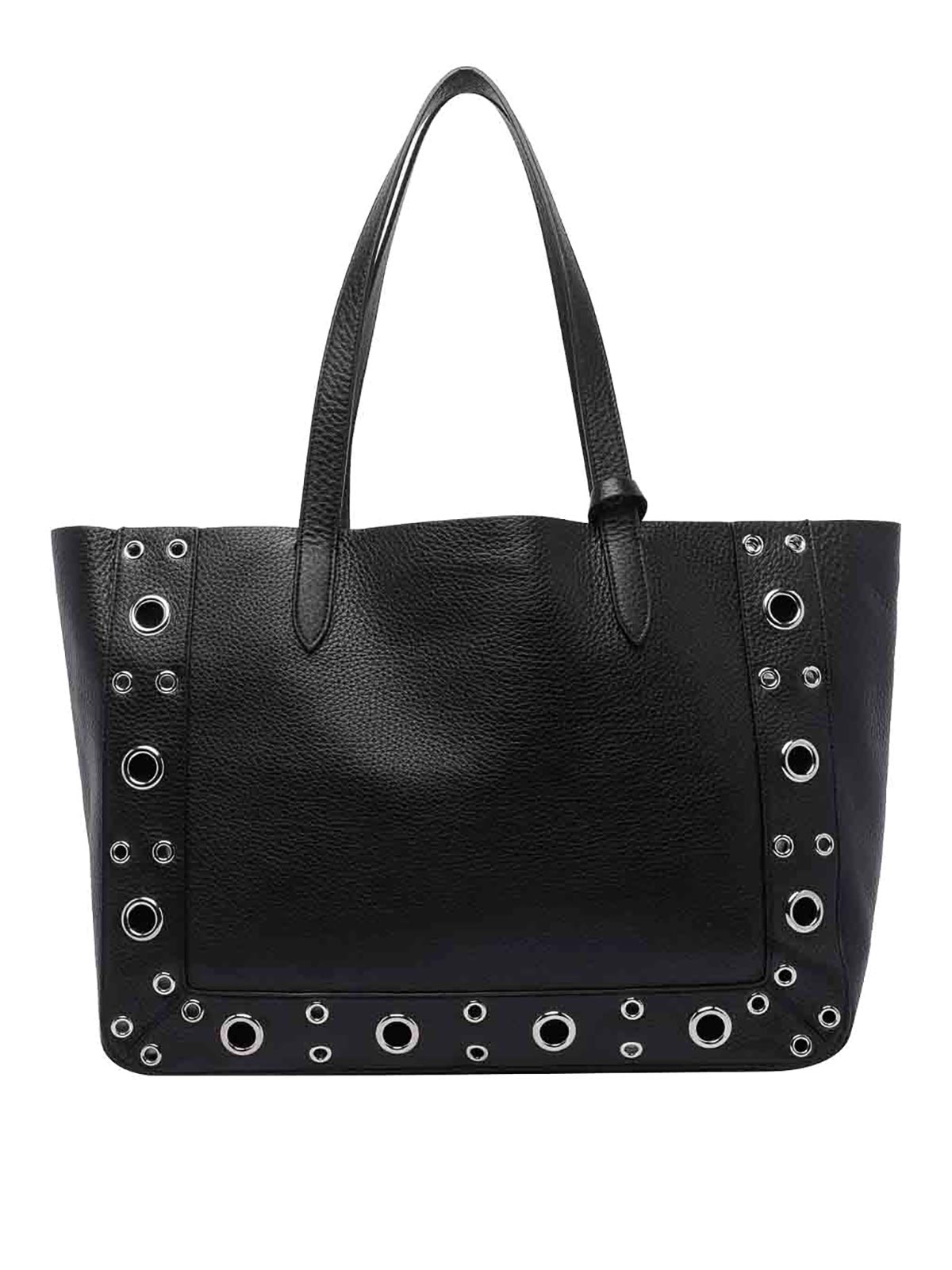 Bolsa de compras negra mediana en forma de nellcote con asas de bolsillo extraíbles con cremallera y tachuelas frontales con el logotipo