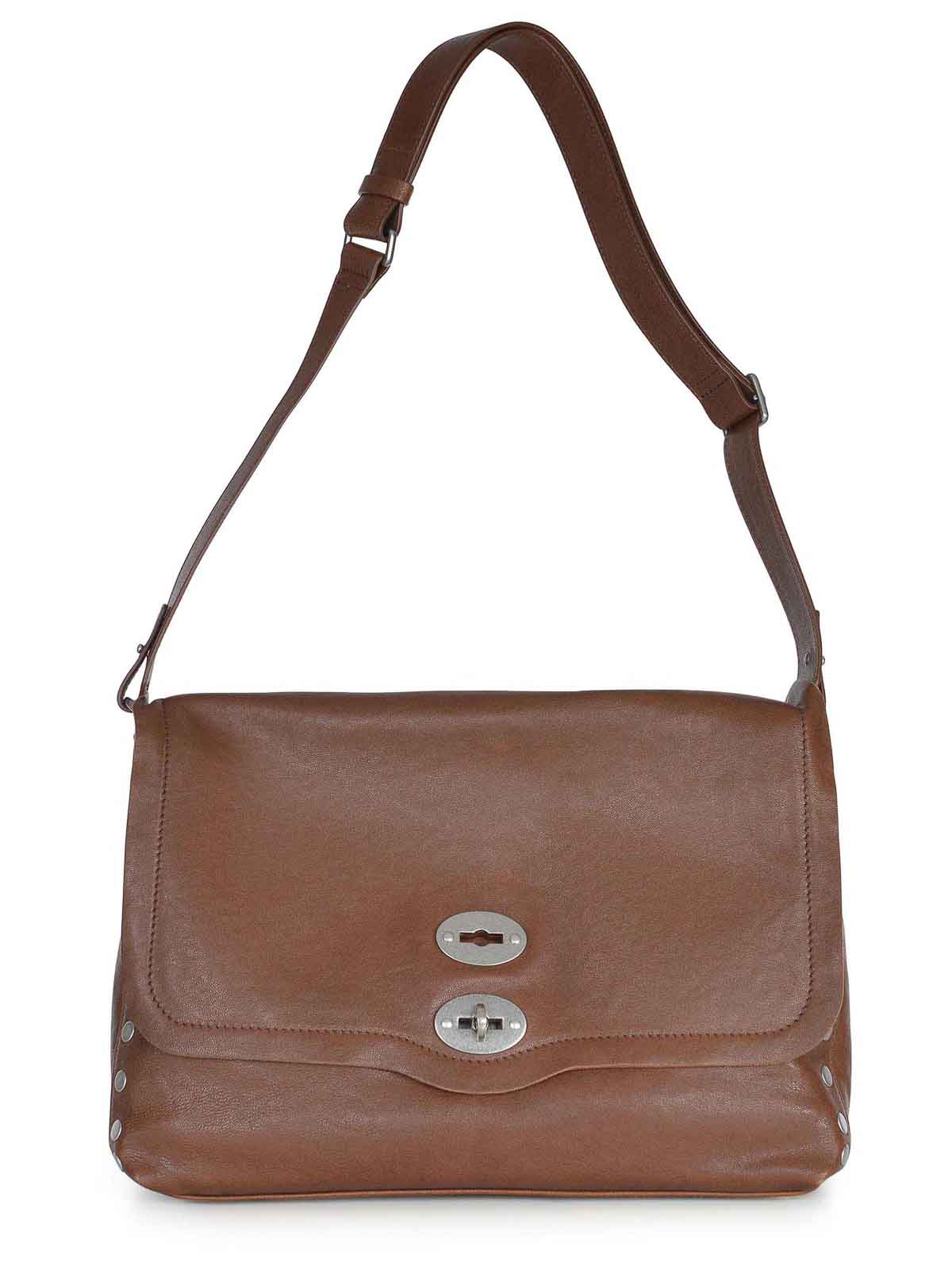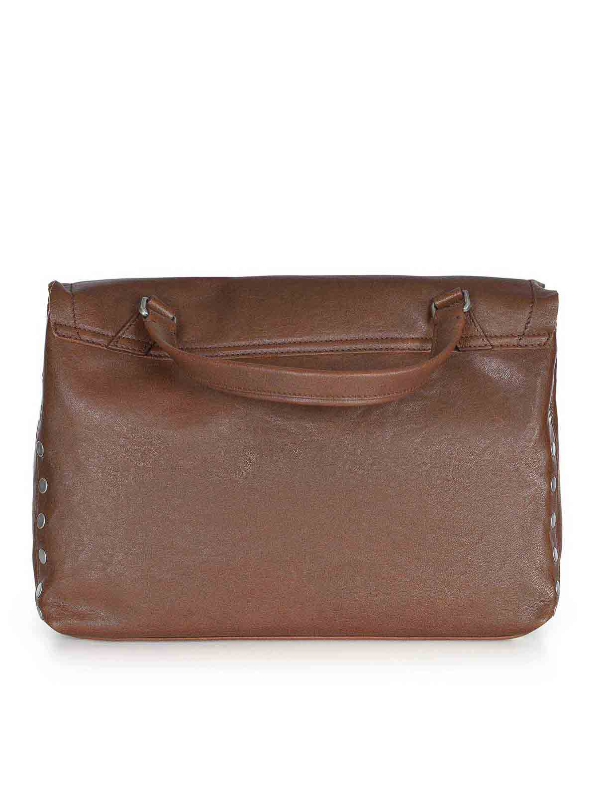 Bolso Zanellato 'postina dailym' de piel lisa de color marrón con inserciones de metal plateado. detalles de «tachuelas» aplicados en los laterales. Asa superior. Solapa con cierre, cierre giratorio de metal. Interior forrado. Parche con el logotipo de piel aplicado en el interior. bolsillo de pared interno con cremallera. doble compartimento. se puede llevar en la mano, en el hombro o en bandolera de piel ajustable, extraíble. Tirantes de piel doble tono sobre tono. ancho 35 cm de altura 21 cm de profundidad 17 cm de mango 14 cm 100% piel italia