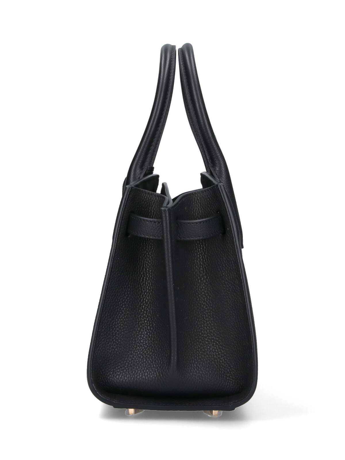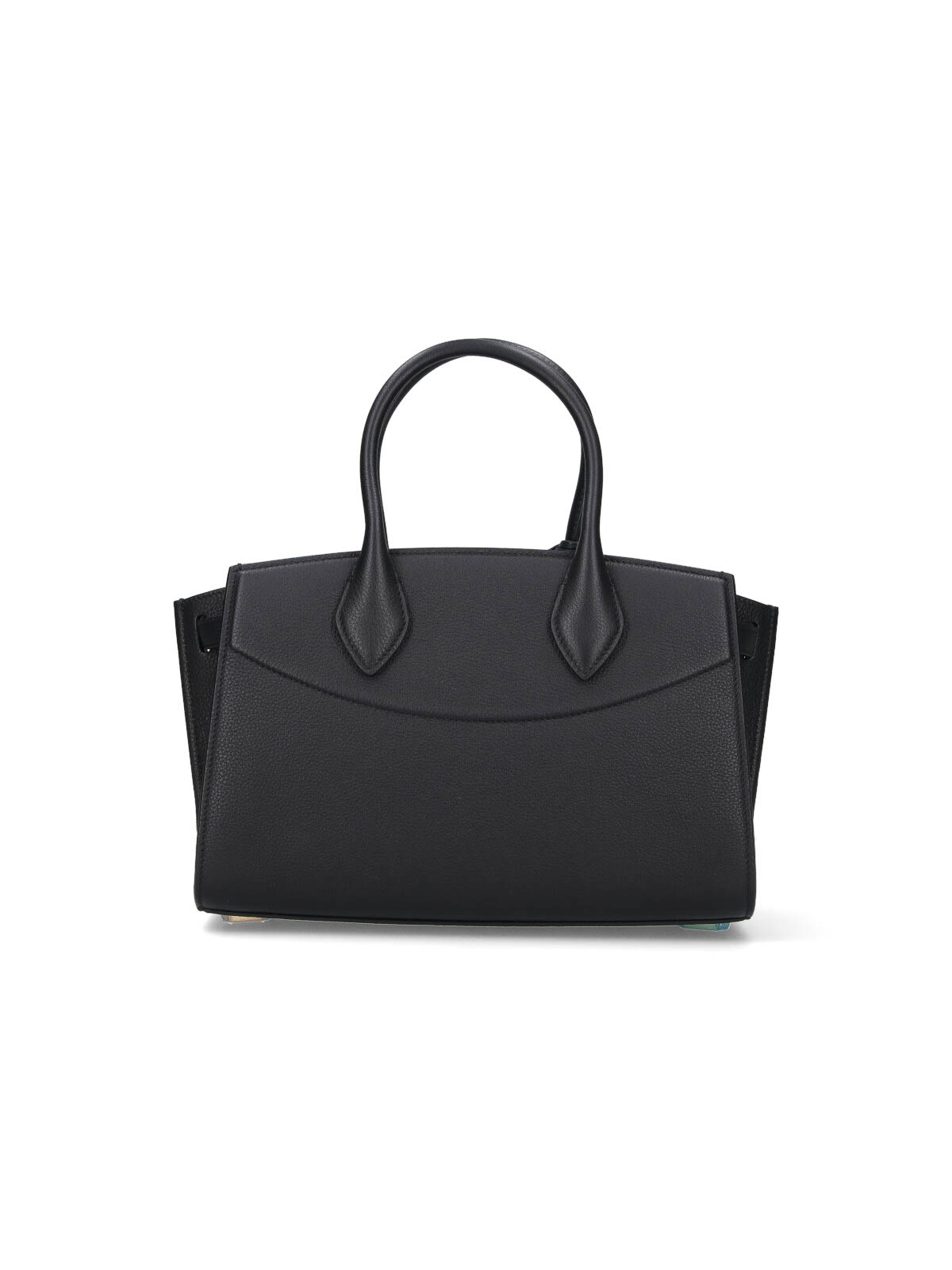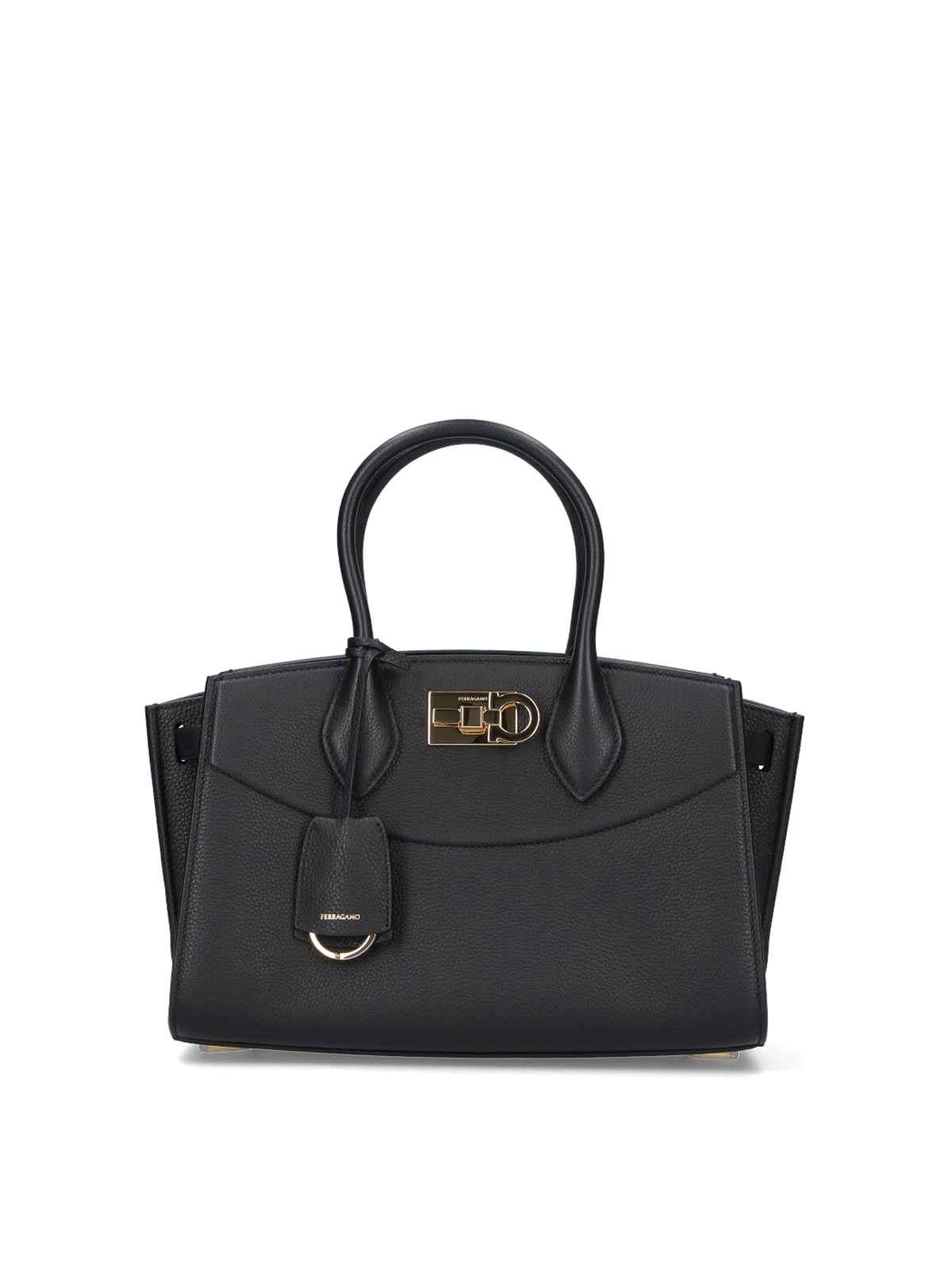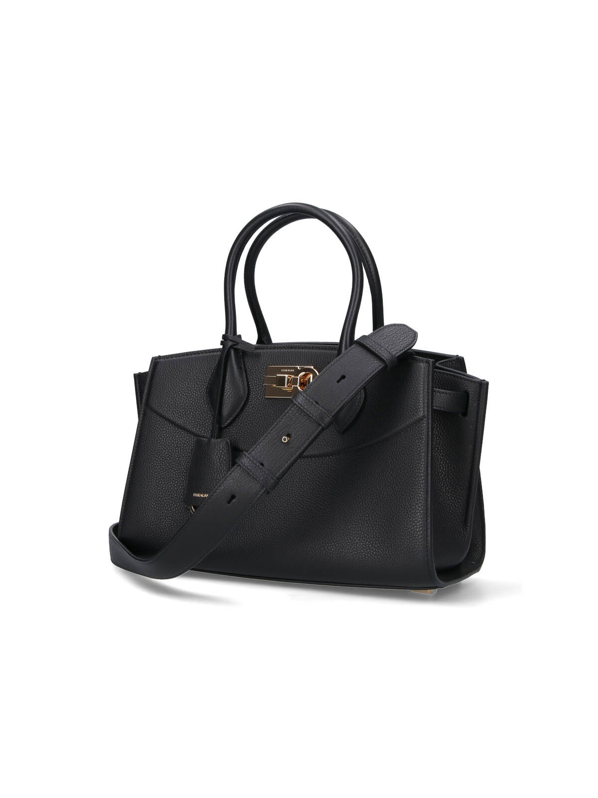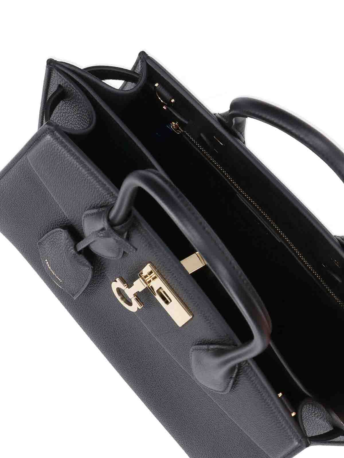 Bolso mediano suave Ferragamo Studio, de piel texturizada negra, dos asas superiores, correa de hombro ajustable y extraíble, cierre de gancho de metal dorado, logotipo grabado tono sobre tono en la parte delantera, llavero extraíble, un bolsillo interno con cremallera y dos compartimentos internos principales.