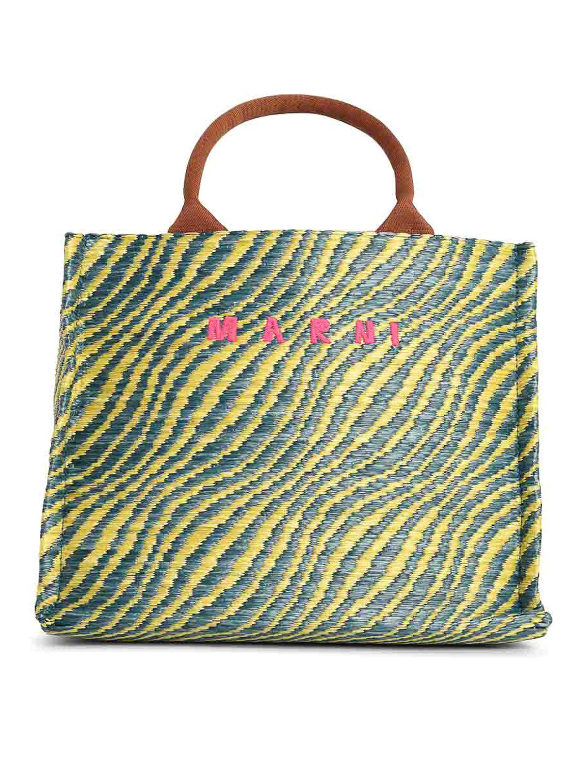 Estampado de cebra bicolor, dos asas de cinta de algodón y correa de hombro larga, forro de tela con bolsillo con cremallera, logotipo de Marni bordado en la parte delantera\ 32 x 25 x 13 cm
