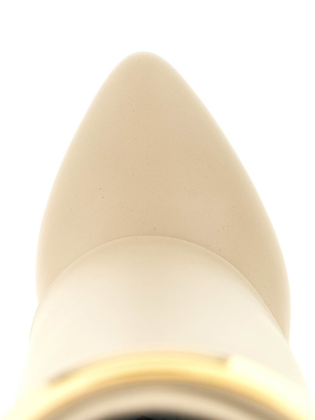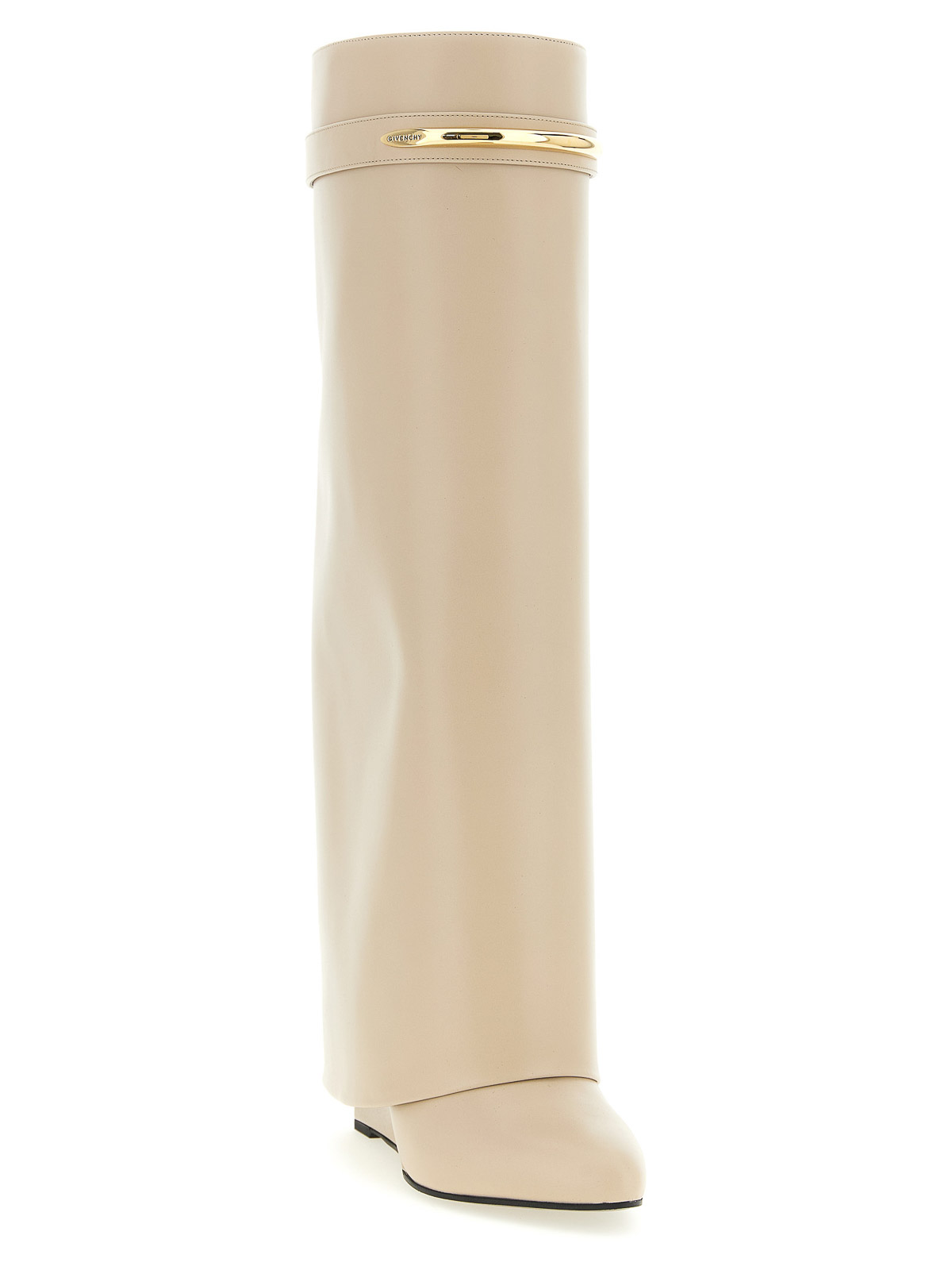 Bota de piel de becerro, línea «tiburón pellizco», modelo puntiagudo, pernera tubular con detalle de agarre metálico con logotipo grabado, cuña cubierta y suela de piel.