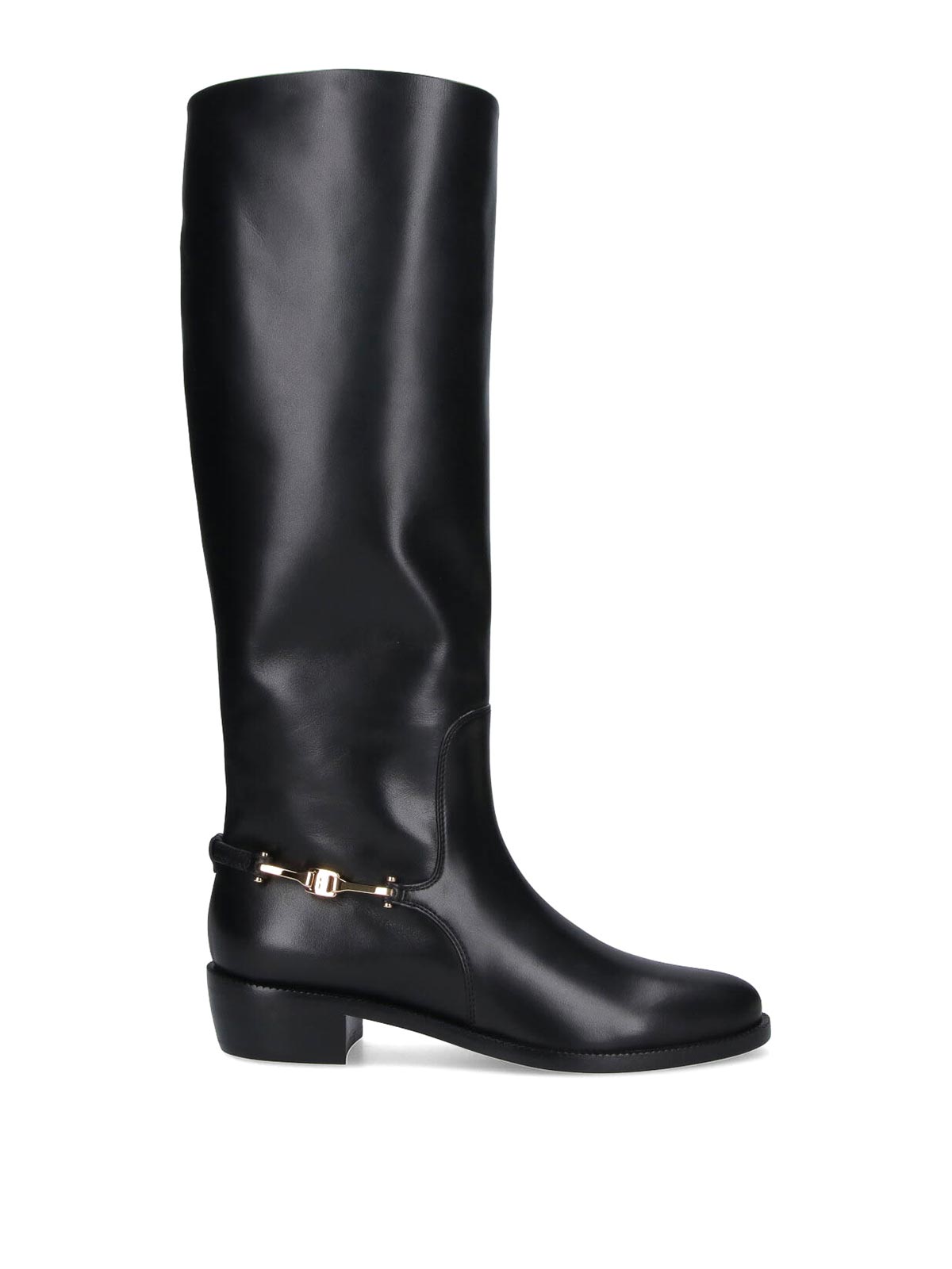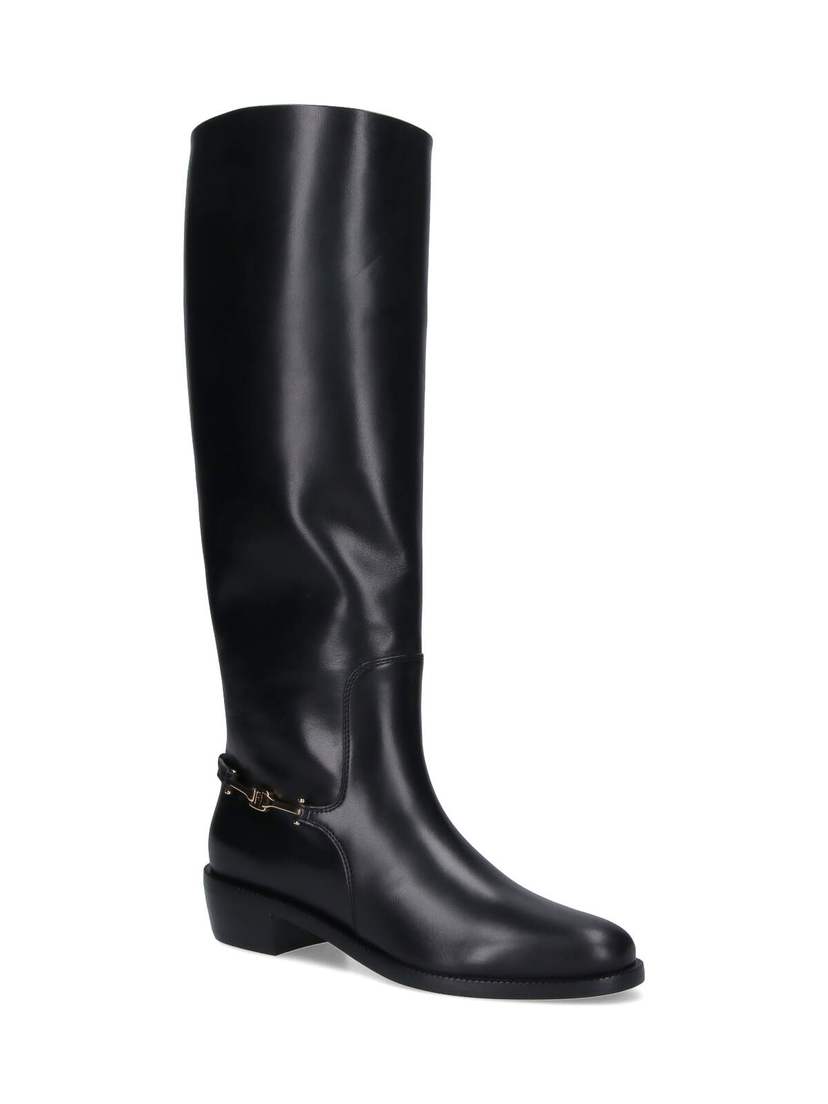 Botas Ferragamo F, de piel de becerro negra, punta redonda, pinza de metal dorado, detalle de logotipo grabado tono sobre tono en el lateral, tacón cuadrado, corte sin cordones.