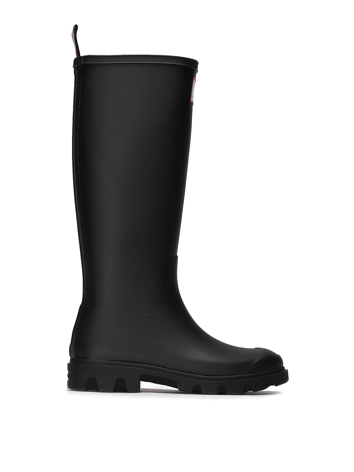 Botas altas de goma con logotipo aplicado en la lengüeta delantera y trasera, suela baja, resistentes a la lluvia.
