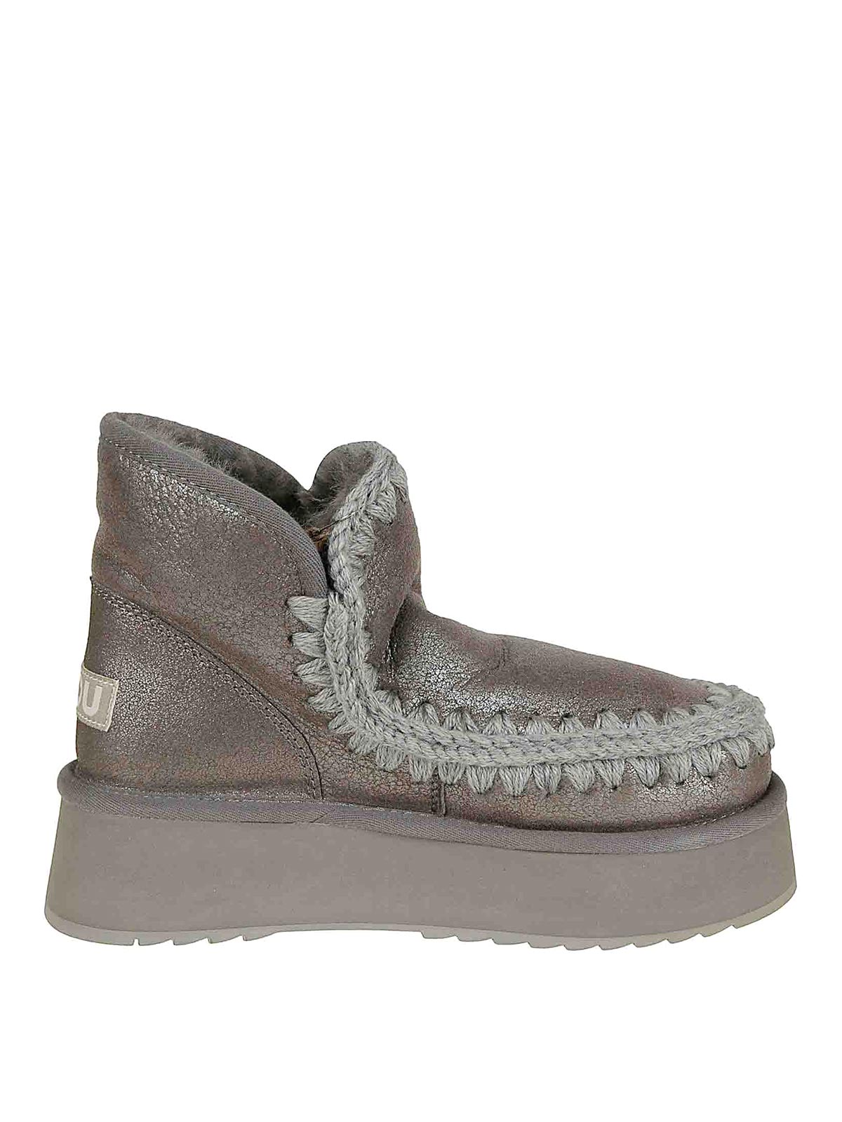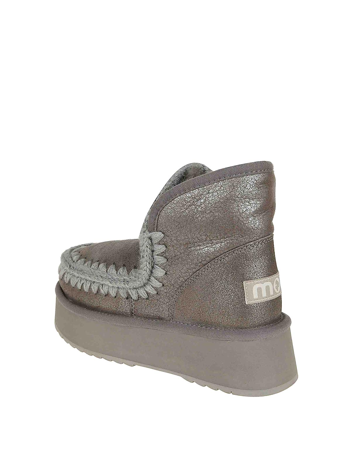 Bota de plataforma esquimal Mou mini, confeccionada en piel de oveja de gamuza con detalles cosidos a mano, con una suela plana de 50 mm, un parche con el logotipo en la parte posterior, punta redonda, forro de piel de oveja y suela de goma.