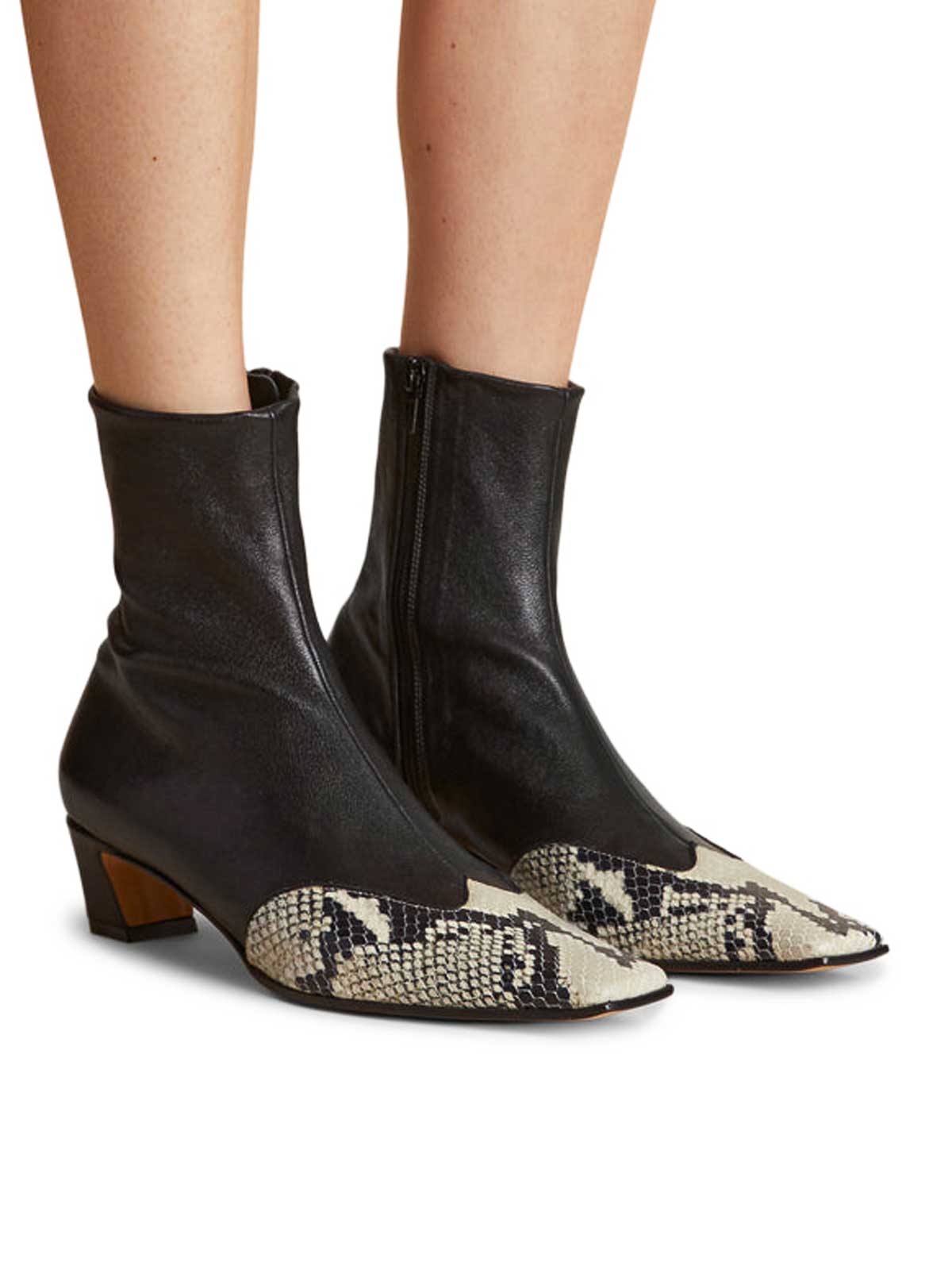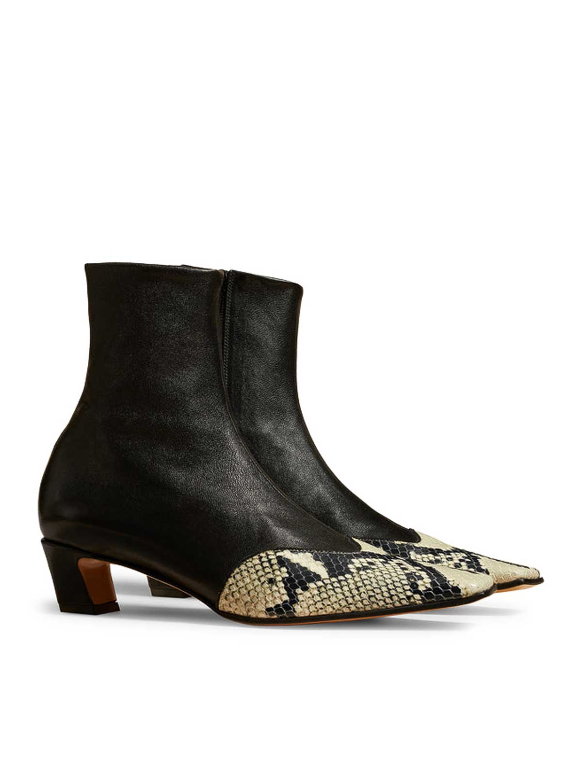 Punta estilizada en forma de cola de milano con escamas en relieve, diseño de cremallera lateral, longitud baja hasta el tobillo, color negro