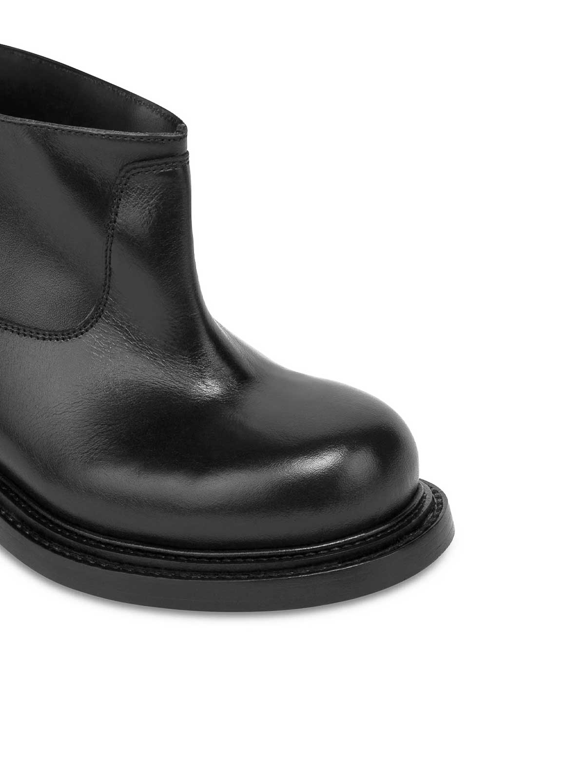 Botín corto en color negro. Bota corta de piel Moschino con cuello ancho y punta redonda exagerada. Cuello ancho, punta redonda exagerada, doble ribete y tacón.