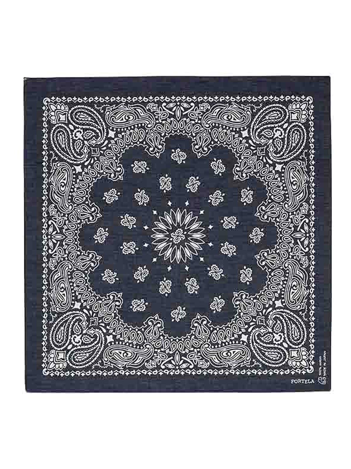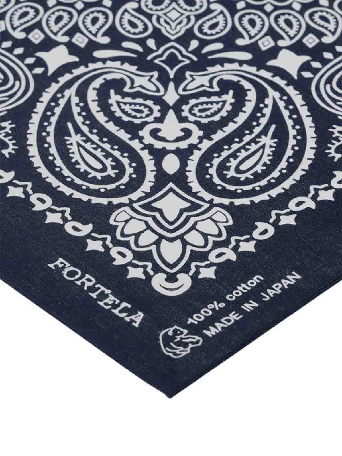 El pañuelo Fortela, imprescindible para realzar tu look con un toque de sofisticación y distinción. Confeccionado con muselina de algodón japonés de primera calidad, es ligero y suave al tacto. El clásico y atemporal motivo de cachemir está estampado sobre un fondo azul intenso, con un acabado que recuerda la estética vintage de los pañuelos militares y de trabajo. Su tamaño lo hace extremadamente versátil: se puede llevar alrededor del cuello, en la muñeca, como accesorio de bolsillo o atado a un bolso. Los bordes bordados añaden un toque artesanal adicional, un accesorio icónico diseñado para completar cualquier look con personalidad, inspirado en el estilo atemporal de la marca.