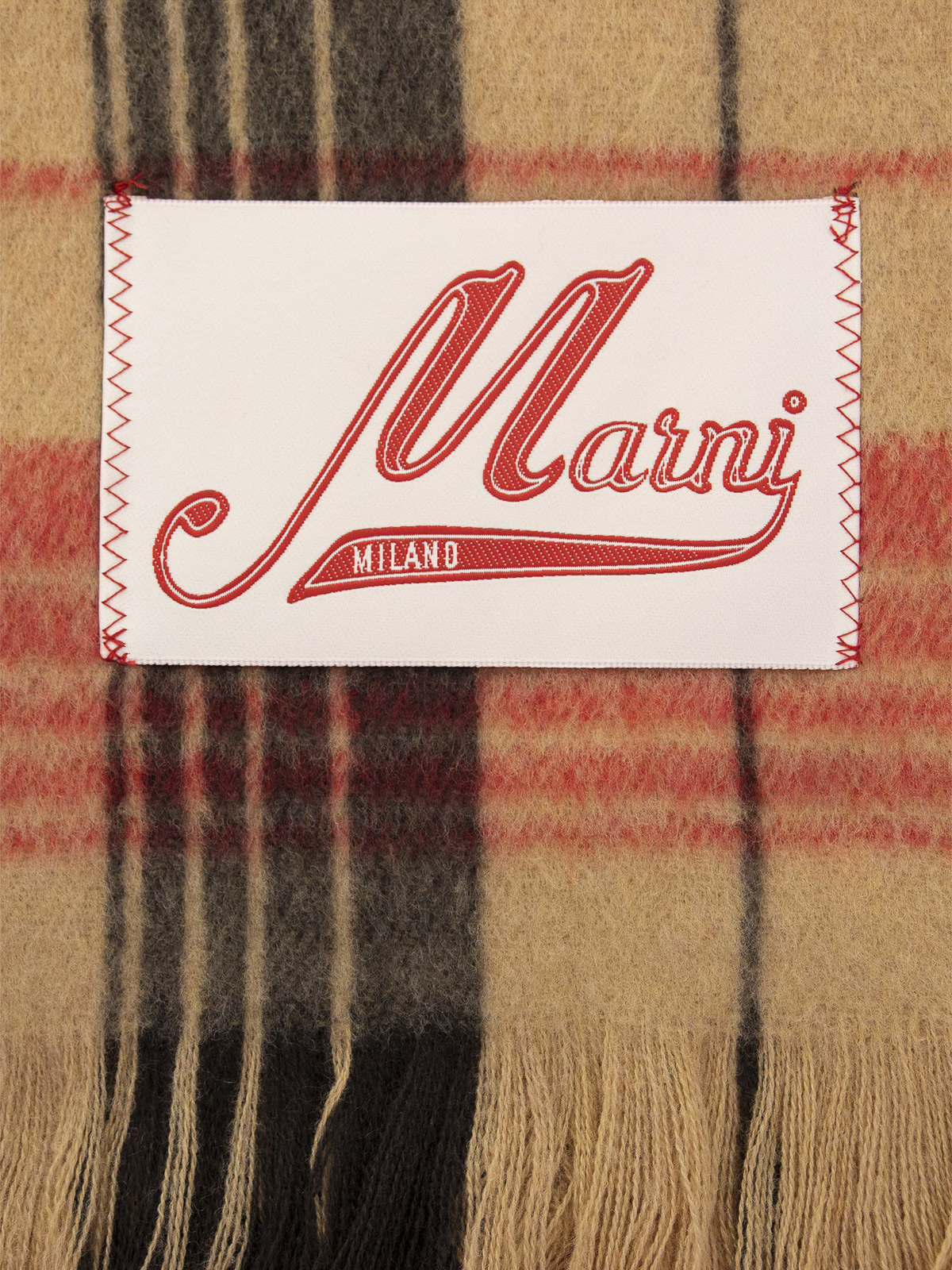 Bufanda de lana a cuadros con etiqueta de la marca y flecos.