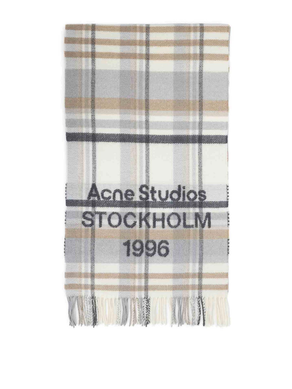 Bufanda de lana blanca Ays de Acne Studios. Confeccionada en lana y cachemir. Logotipo característico en gris en contraste en la parte delantera, detalles de flecos laterales. Estampado de cuadros blancos, beige, grises y marrones en toda la prenda.