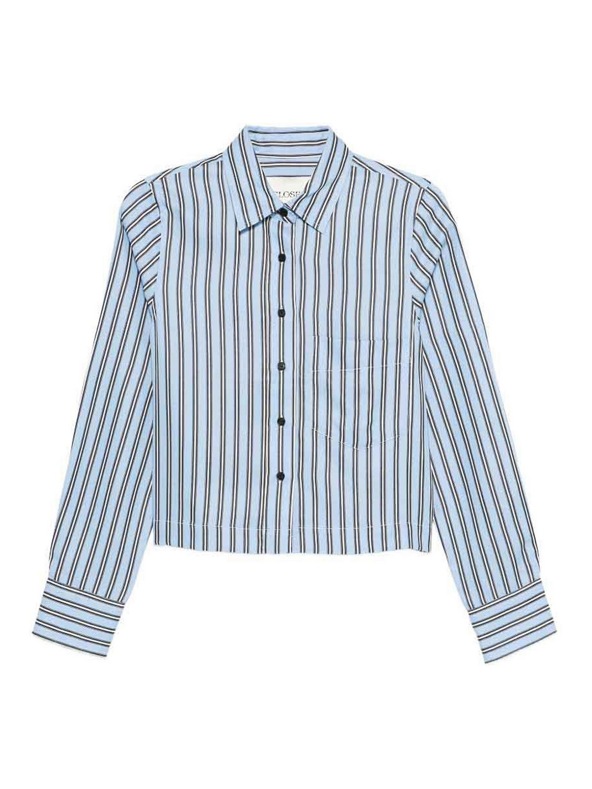Bolsillo en el pecho con estampado de rayas azules, cierre con botones en la parte delantera, puños abotonados, diseño recortado