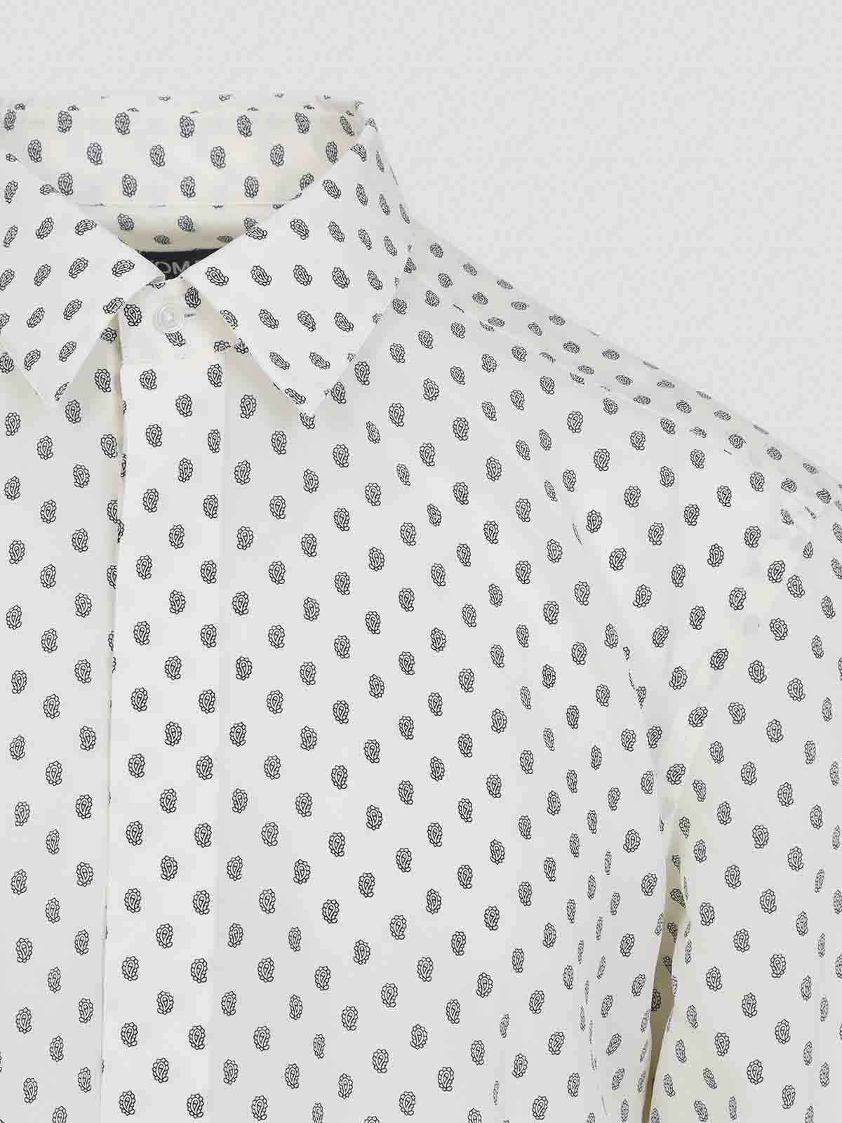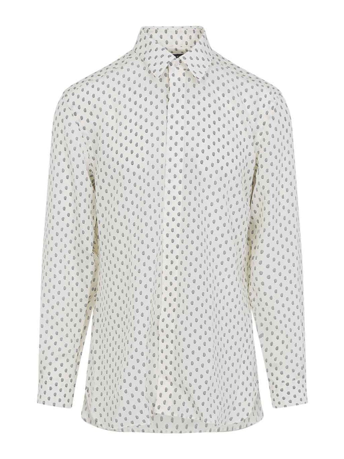 Camisa de seda fluida blanca y azul de Tom Ford. Confeccionada en crepé de china blanca, microestampado azul por todas partes, cuello puntiagudo, cierre con botones ocultos en la parte delantera, manga larga con puños abotonados, canesú en la espalda y dobladillo redondo.