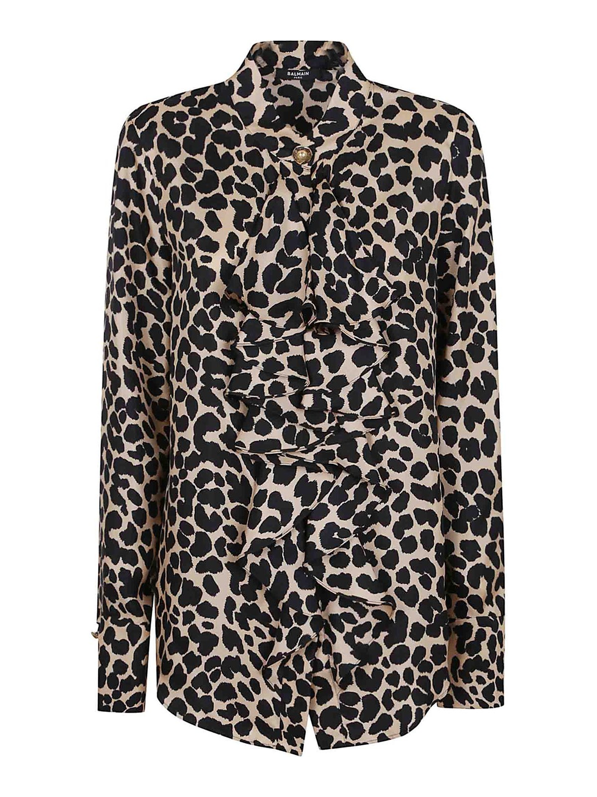 Camisa serge con estampado de leopardo de Balmain. Cuello clásico, cierre frontal con siete botones, mangas largas, puños rectos con tres botones, dobladillo redondeado y corte recto y fluido. Presenta botones metálicos con forma de monedas doradas y doradas y un cierre con volantes tipo jabot.