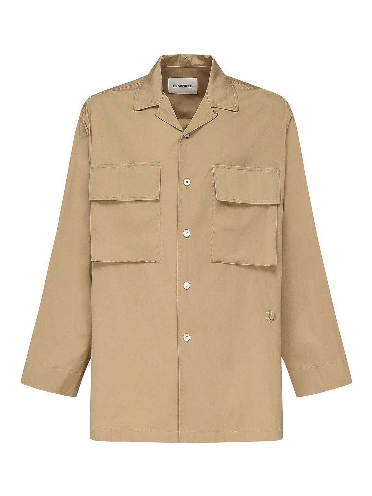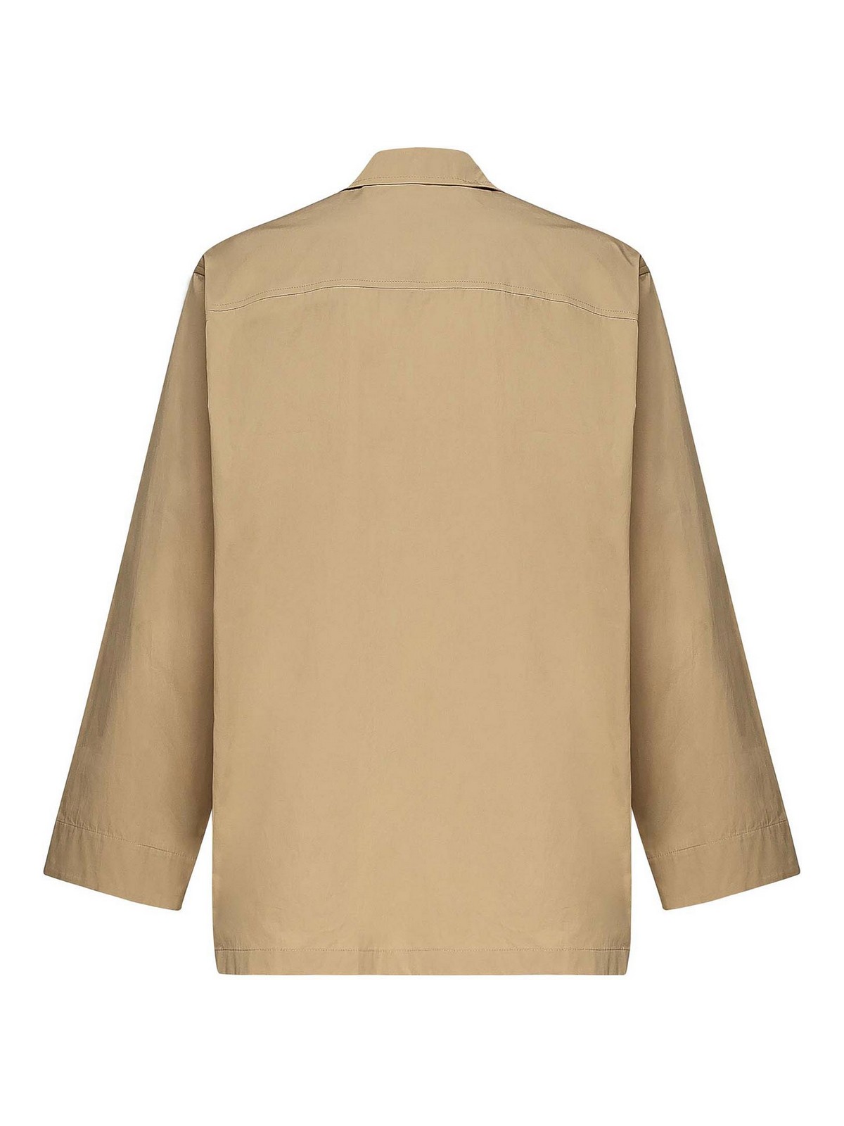 Cuello de bolos abierto con botones, hombros suaves, bolsillos de parche, el tamaño que se muestra en la foto es de color cereal