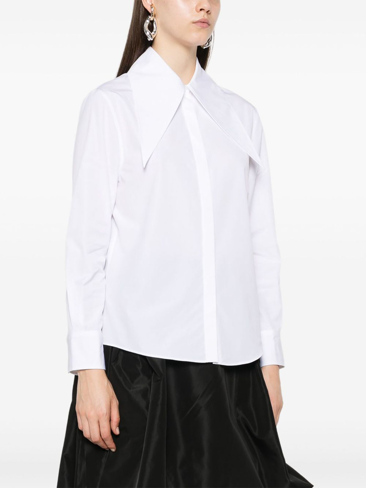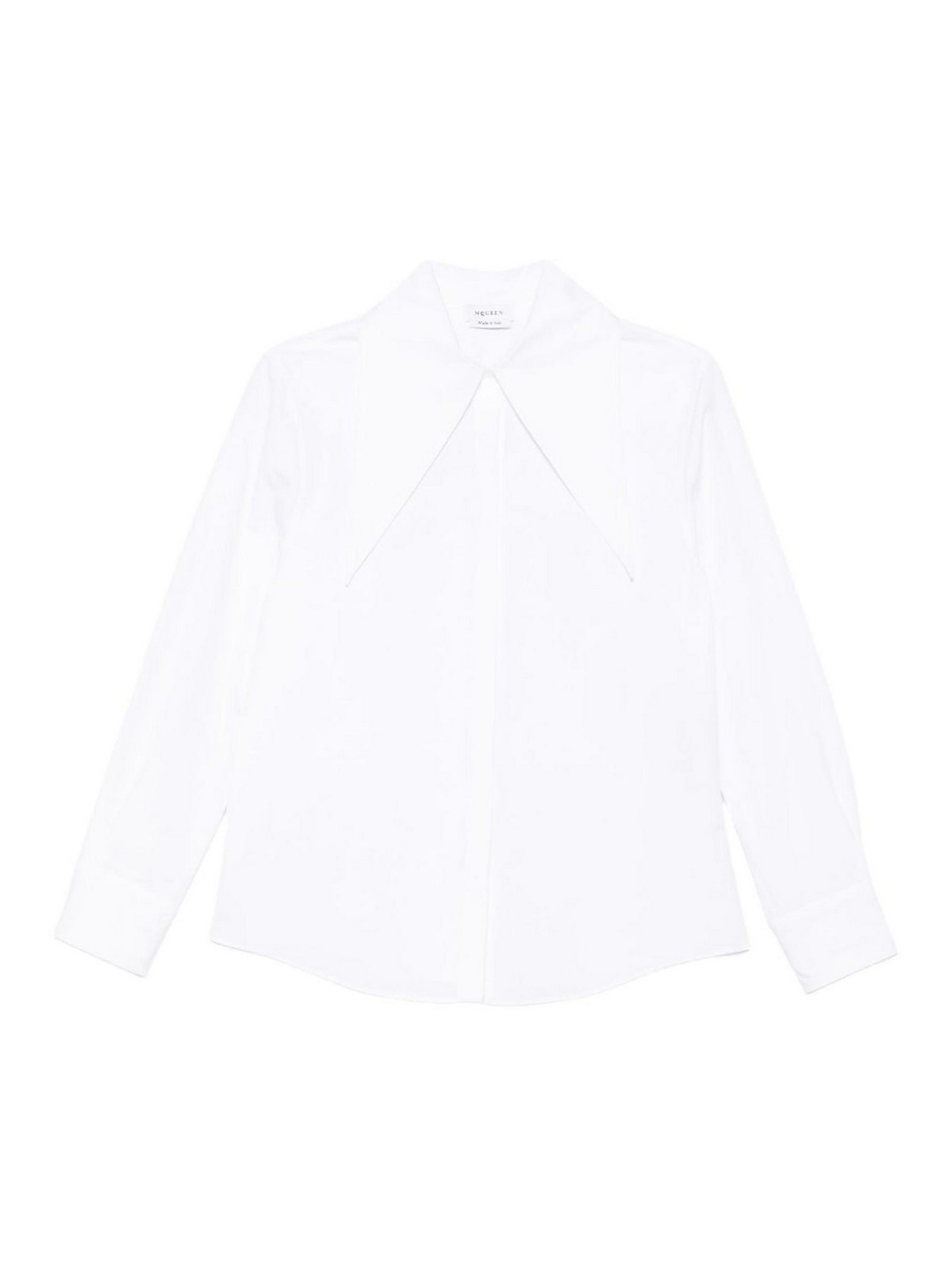 La camisa alexander mcqueen es una pieza icónica que reinterpreta el clasicismo con un toque atrevido, confeccionada en algodón, destaca por su cuello sobredimensionado que le da carácter y estilo al look, en blanco puro, tiene mangas largas y cierre con botones en la parte delantera, perfecta para llevar tanto en contextos formales como en combinaciones más creativas, alexander mcqueen, camisa, blanco, algodón, cuello oversize, manga larga, cierre con botones en la parte delantera