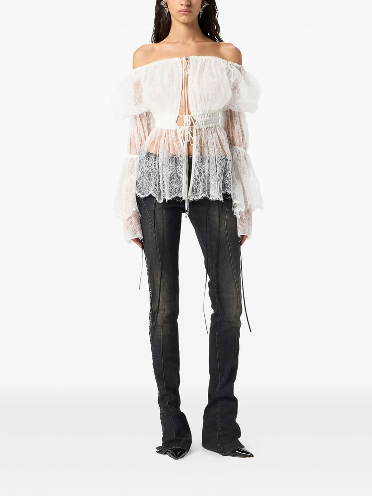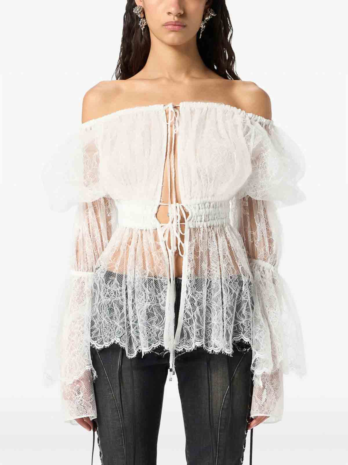 Diseño de encaje blanco marfil, hombros descubiertos, mangas largas, cierre con lazo en la parte delantera