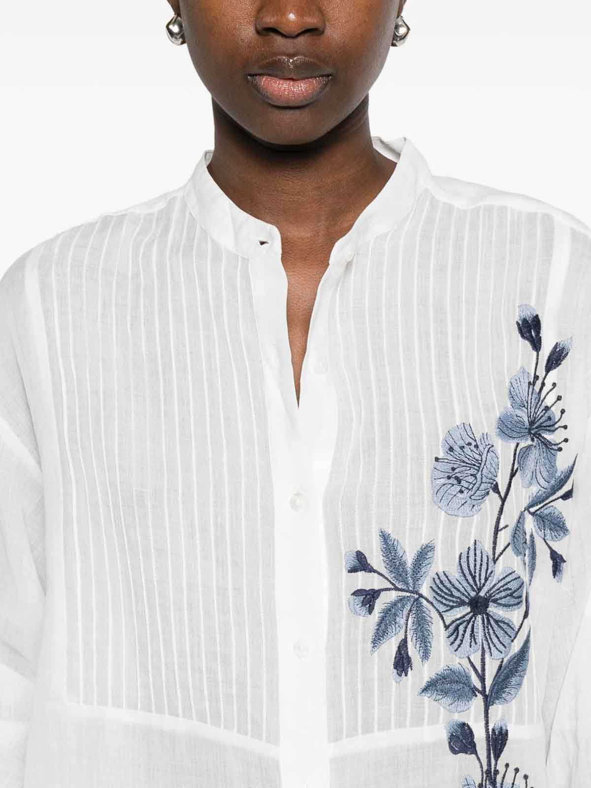Camisa de algodón blanco con inserciones azules, manga larga y cuello mandarín de ermanno firenze. con sutiles detalles en azul y un corte regular, esta camisa combina un estilo refinado con comodidad. Perfecta para atuendos pulidos de día o looks casuales elegantes, es una prenda versátil que encarna la elegancia y la artesanía contemporáneas
