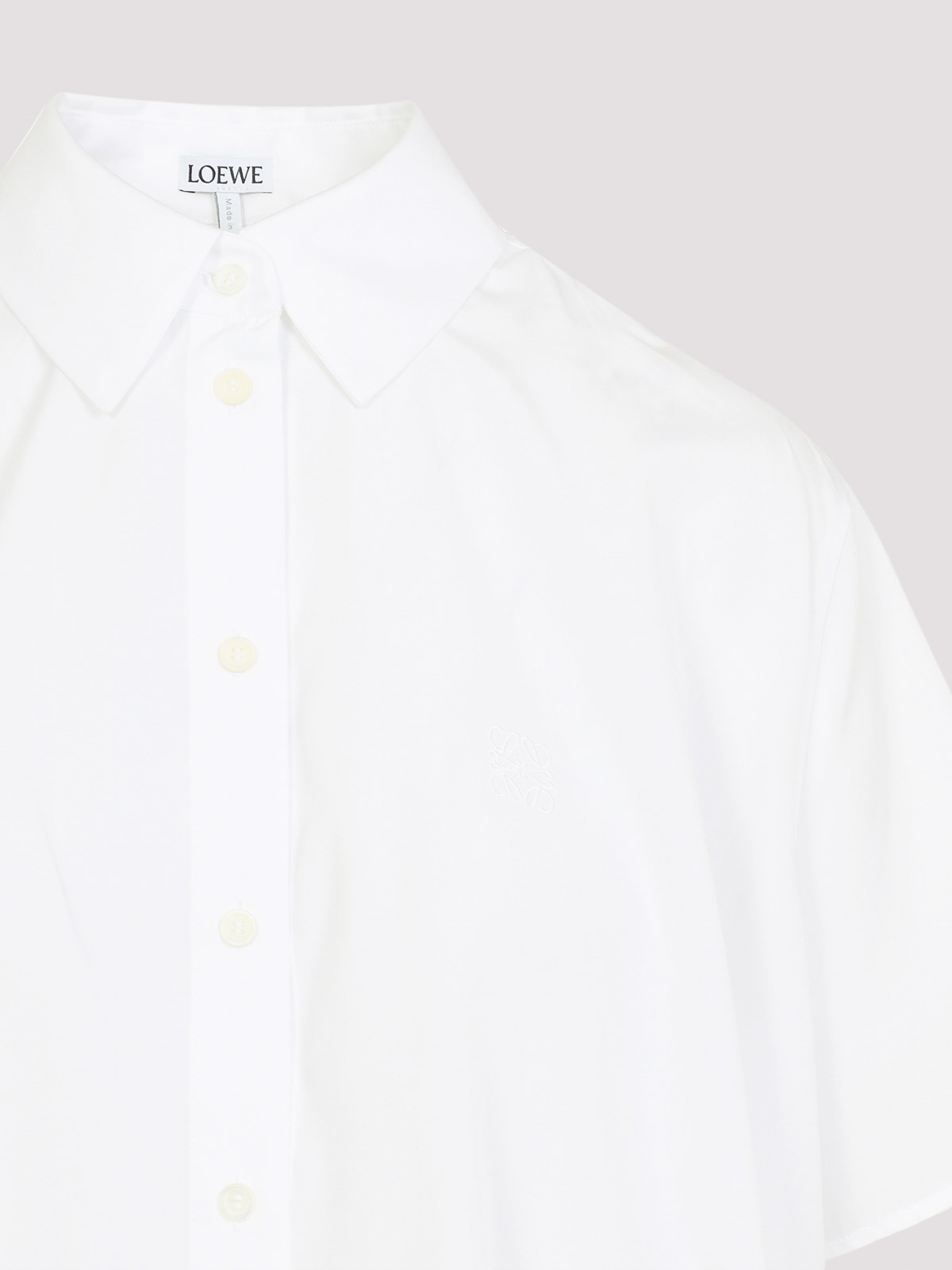 Camisa trapecio de manga corta de algodón blanco Loewe. Confeccionada en mezcla de algodón y poliéster. Cuello puntiagudo, cierre con botones en la parte delantera, manga corta, diseño recortado, dobladillo asimétrico.