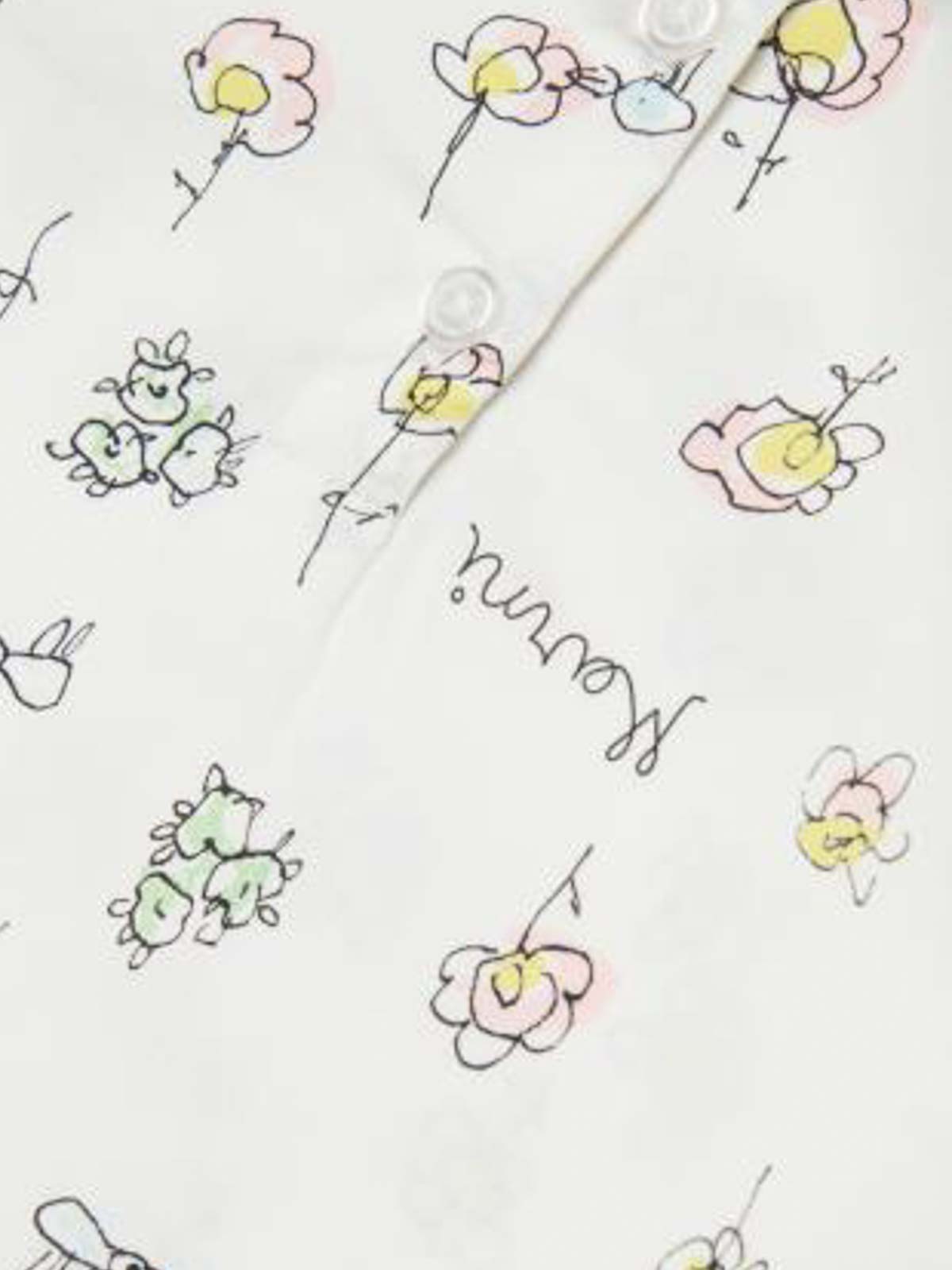 La camisa floral presenta estampado floral blanco, mangas cortas, cuello redondo con botones