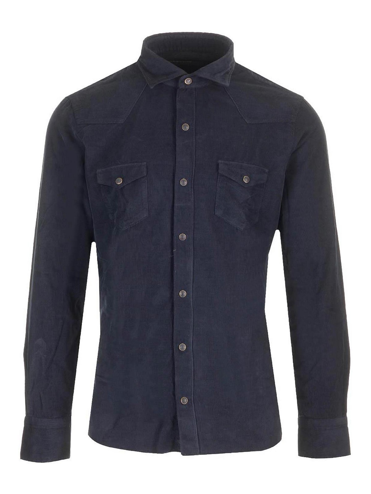 Camisa Barba de manga larga, bolsillos en el pecho con solapa y botón, cierre frontal con botones a presión, aplicaciones tono sobre tono en los hombros.