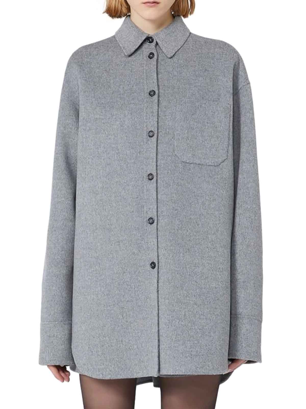 Camisa pura de doble cara, corte extragrande, cuello camisero, tapeta con botones a la vista, bolsillo de parche en el pecho, manga larga, dobladillo redondeado, corte holgado, gris