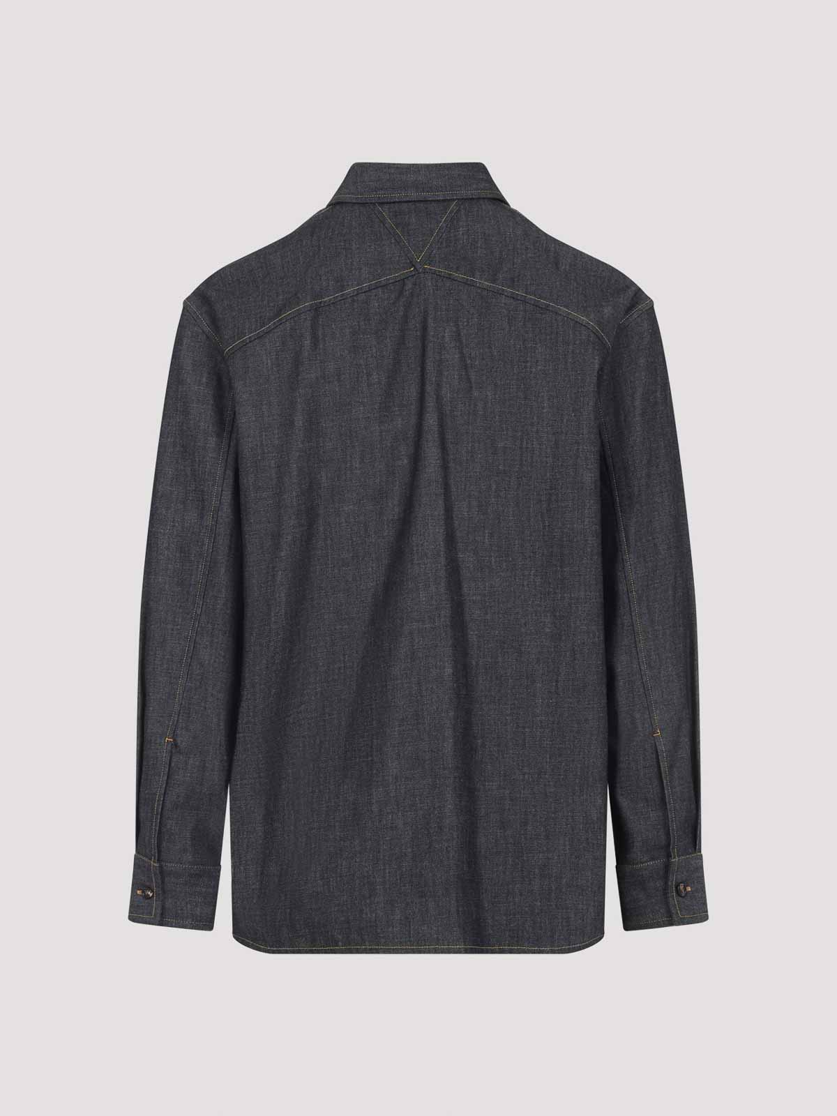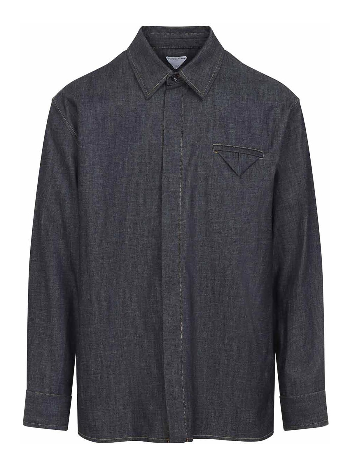 Camisa vaquera azul Bottega Veneta. Confeccionada en mezclilla de algodón azul índigo, cuello puntiagudo, cierre con botones ocultos en la parte delantera, bolsillo ribeteado con un característico inserto triangular en el pecho, canesú trasero en forma de triángulo en la parte posterior, mangas largas, puños abotonados y dobladillo recto.