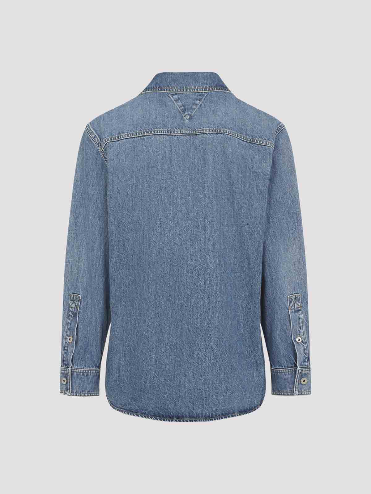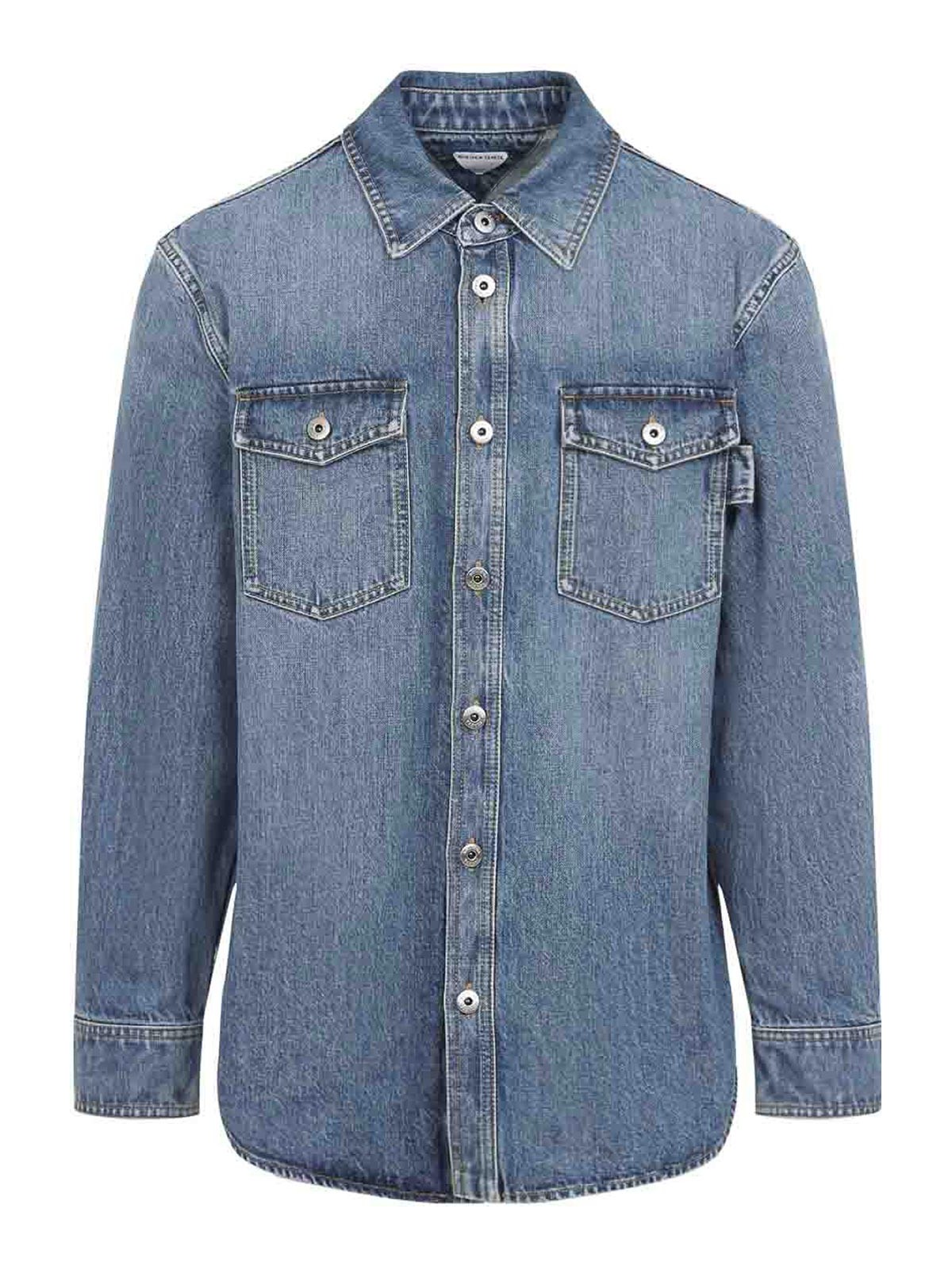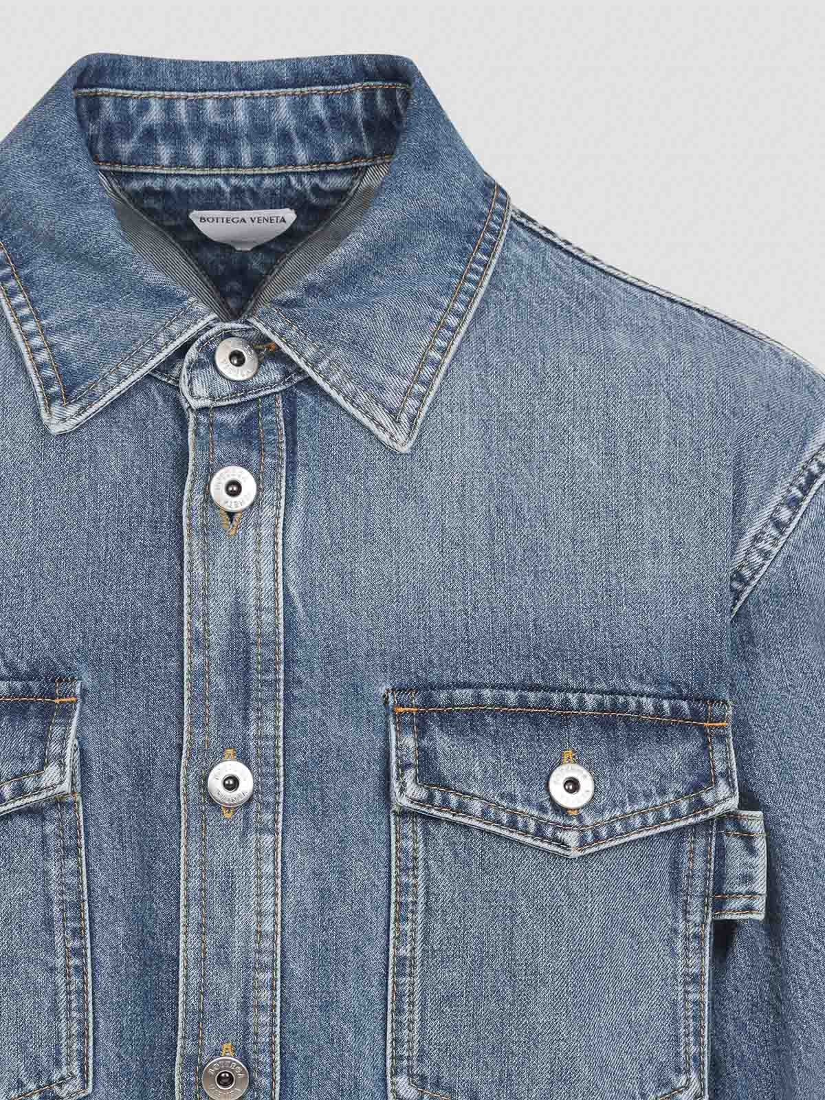 Camisa vaquera Bottega Veneta de color azul medio puro, cuello puntiagudo, solapa en el pecho, bolsillos abotonados, mangas largas, puños abotonados, dobladillo redondo, costuras en contraste, diseño sobrelavado
