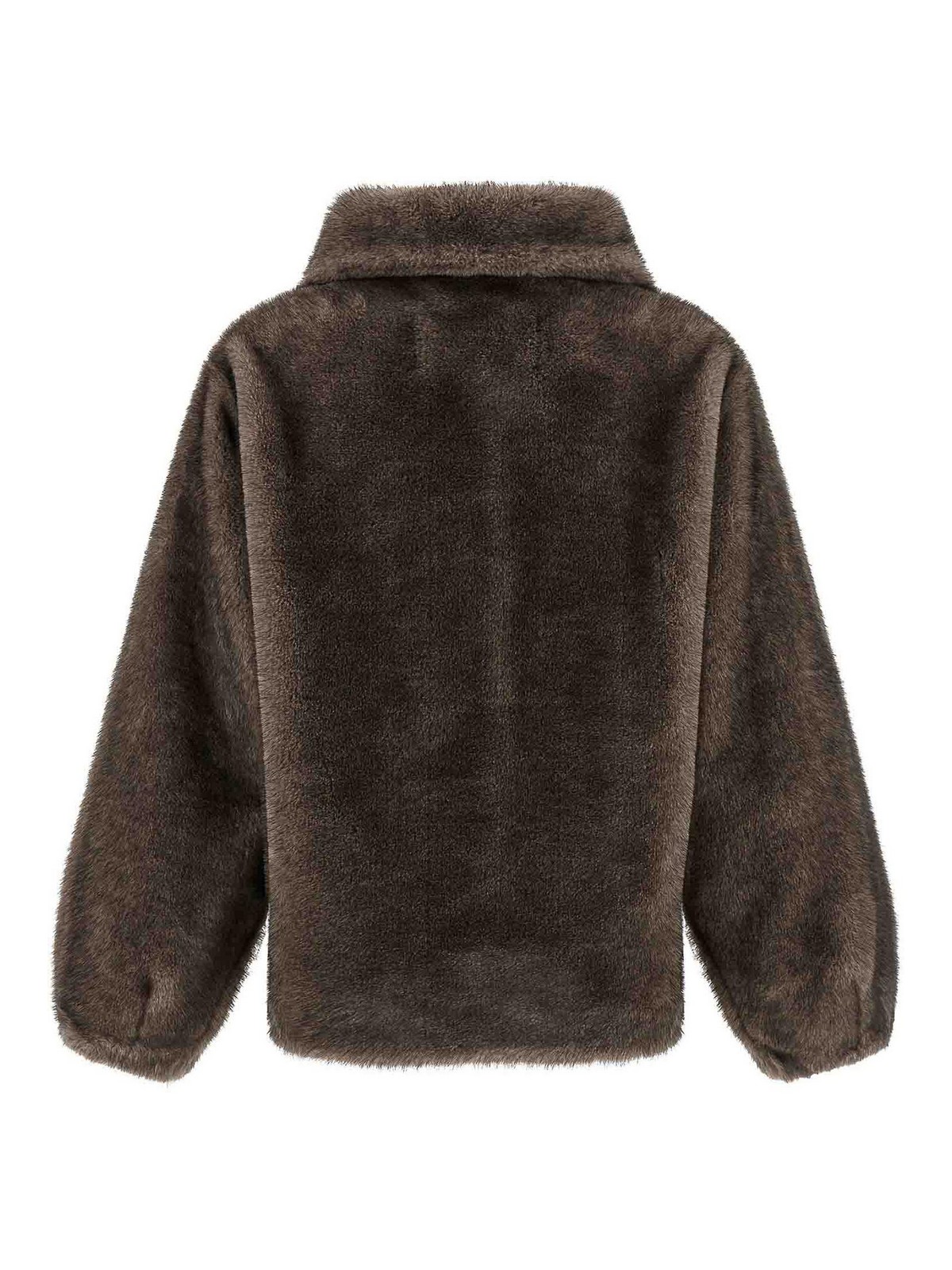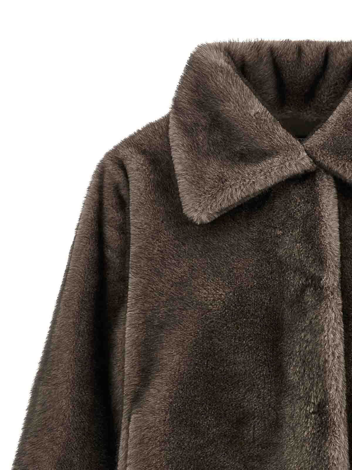 Piel sintética con efecto visón, cuello camisero, cierre con botones a presión en la parte delantera, bolsillos, mangas largas, aberturas laterales, dobladillo asimétrico, sin forro.