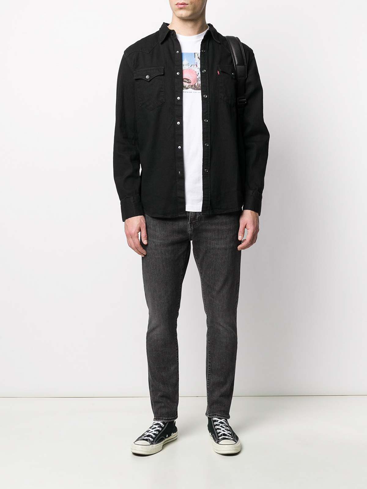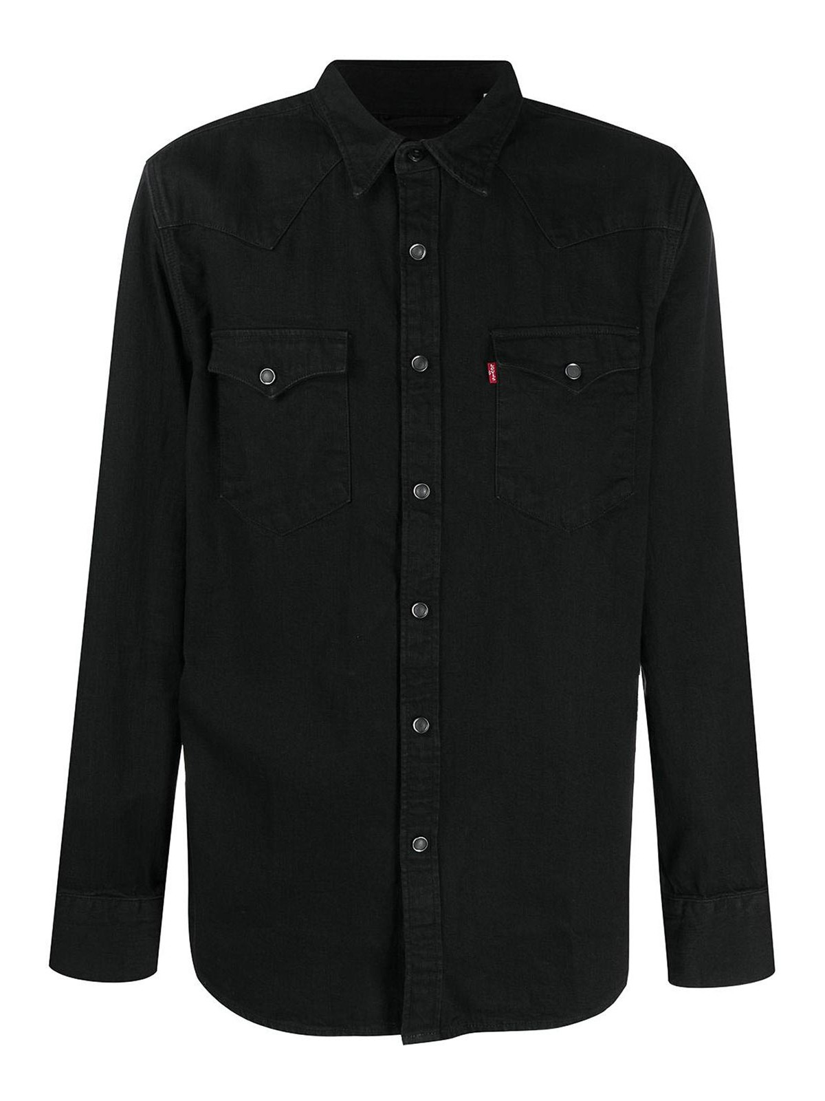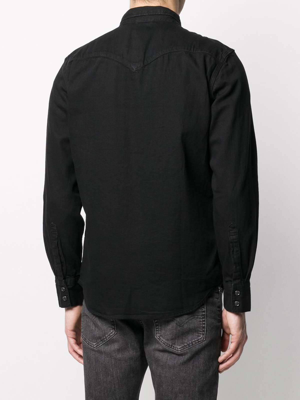 cuello recto, cierre con botones en la parte delantera, mangas largas, puños abotonados, dos bolsillos de parche en el pecho, dobladillo curvo