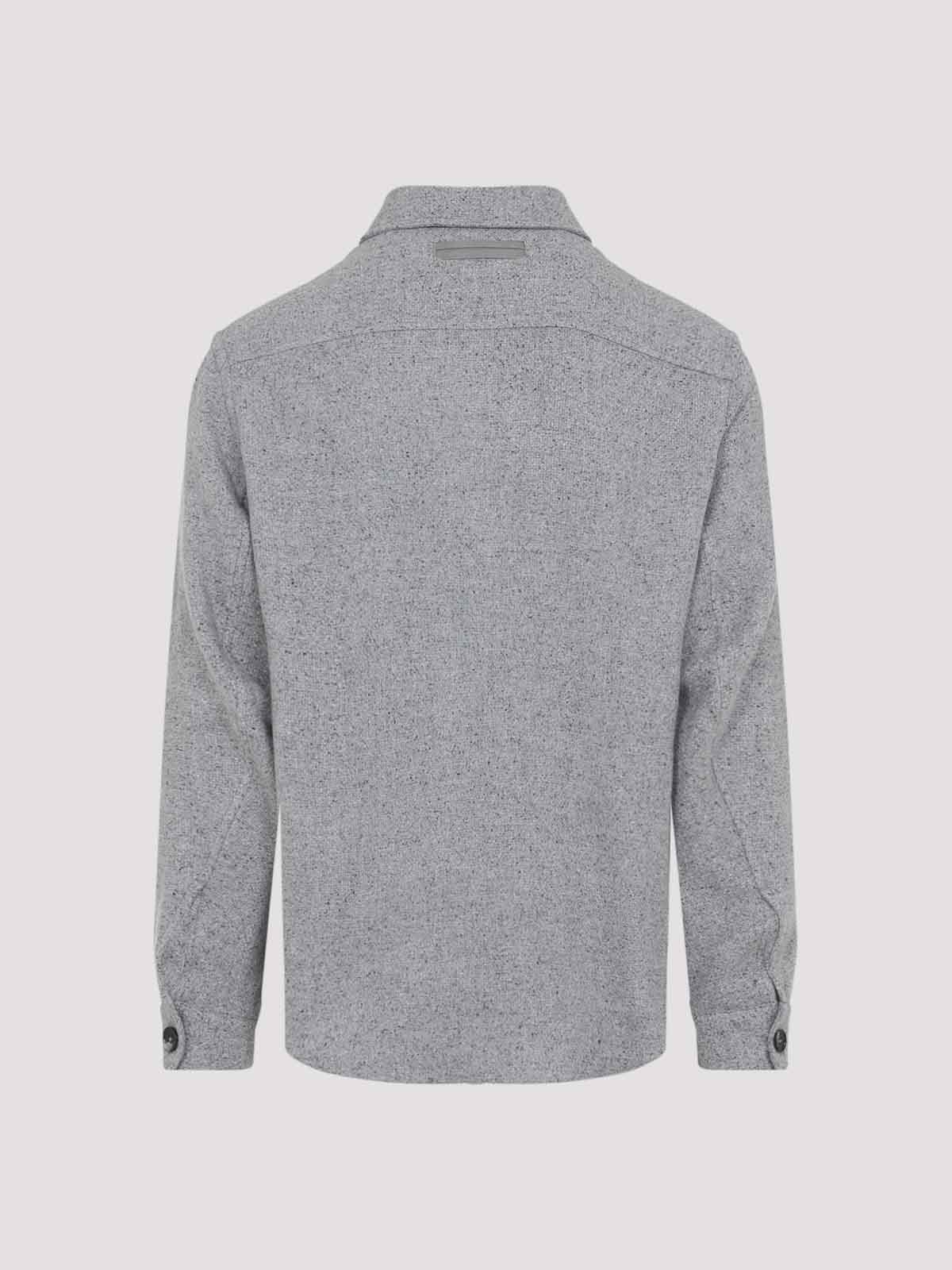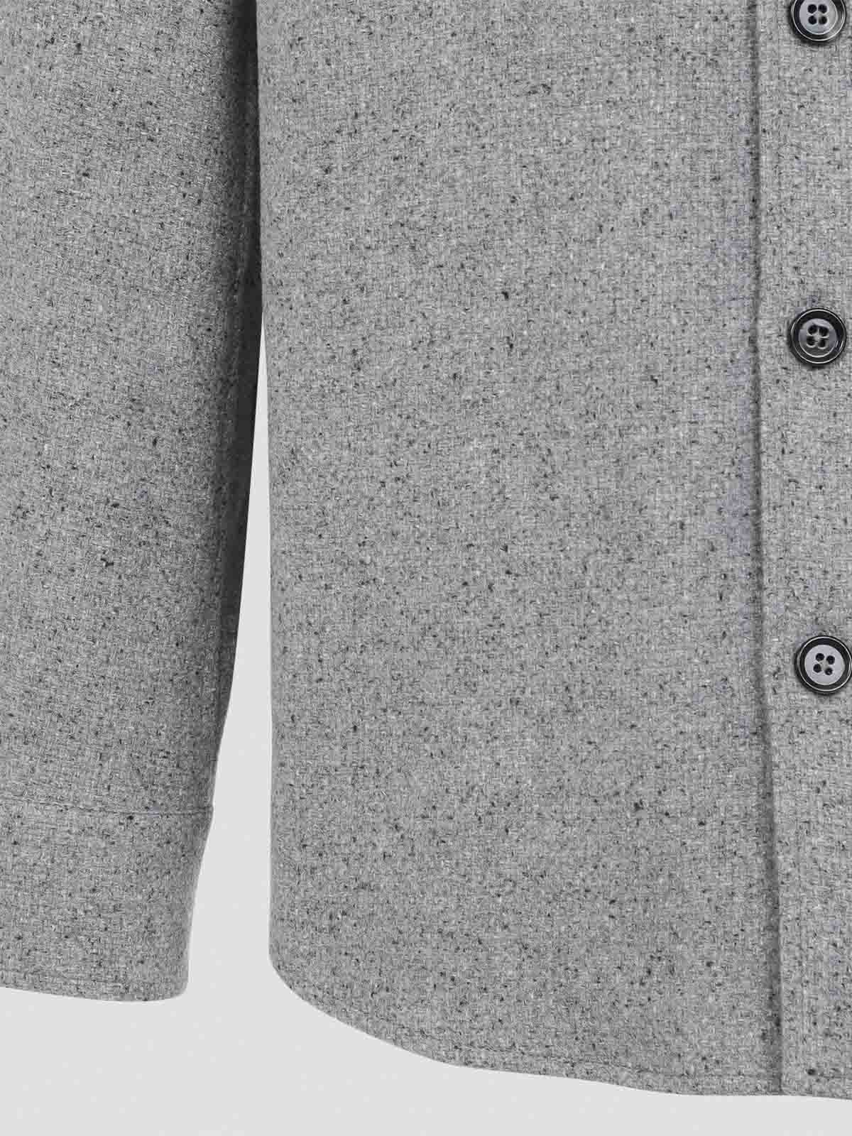 Sobrecamisa gris hecha a mano y en mezcla de moras, cuello puntiagudo, manga larga abotonada, puños abotonados, dobladillo recto, costuras tonales