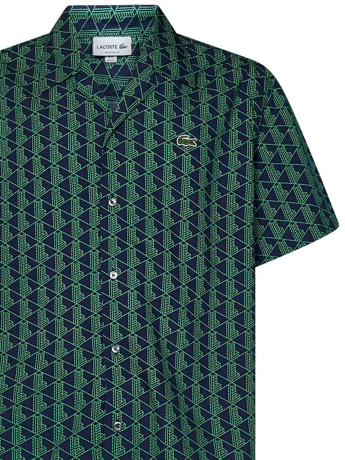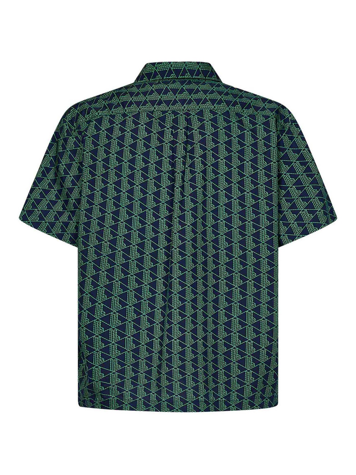 Botones con botones, cuello de bolos, manga corta, parche bordado en todo el pecho, monograma sobreestampado, corte holgado, azul/verde