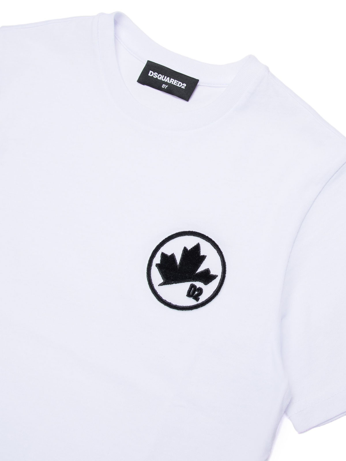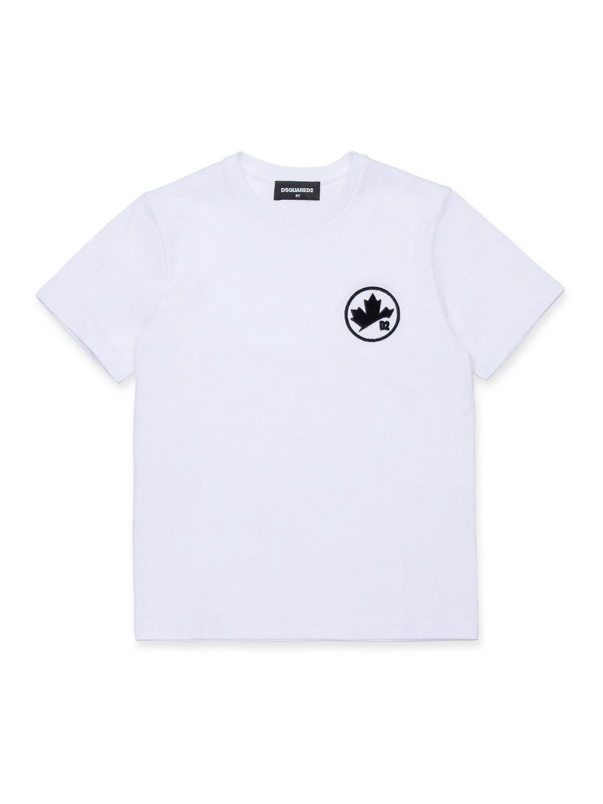 Camiseta blanca de algodón, cuello redondo con estampado de hojas de arce