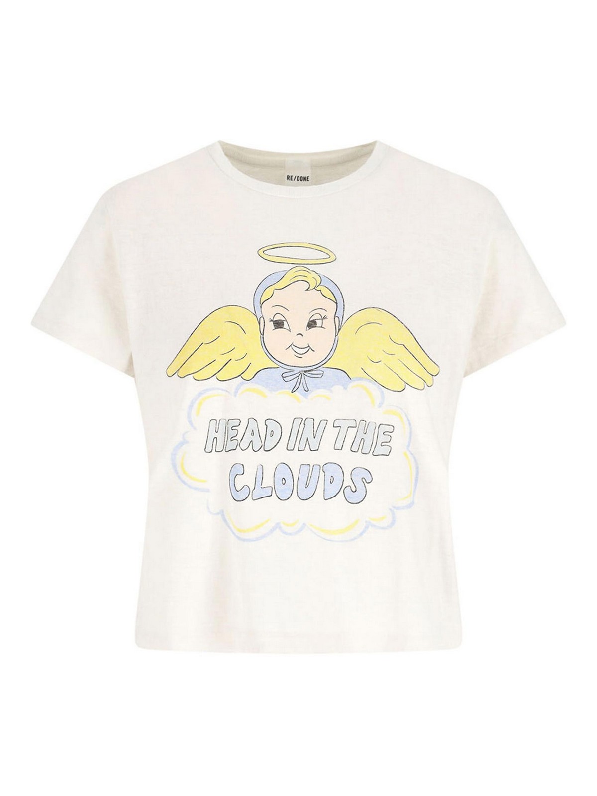 Camiseta Re/done clouds de algodón blanco, cuello redondo, manga corta, detalle estampado en contraste en la parte delantera, ribetes acanalados y dobladillo recto.