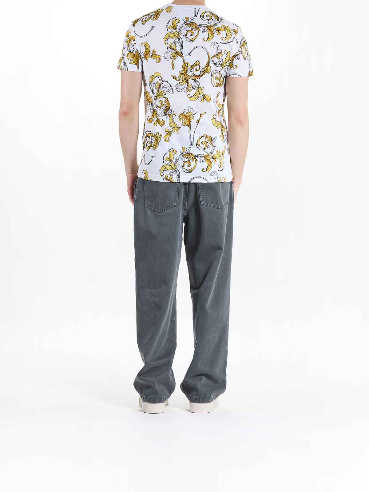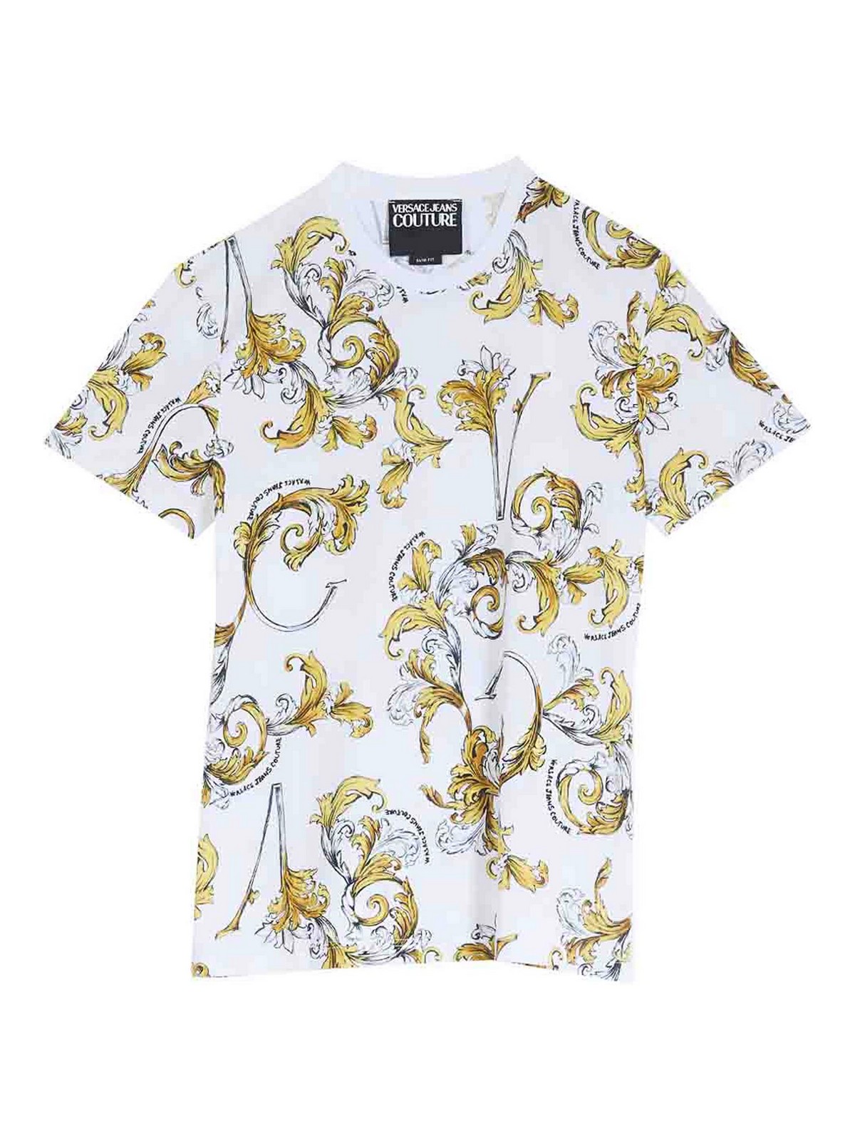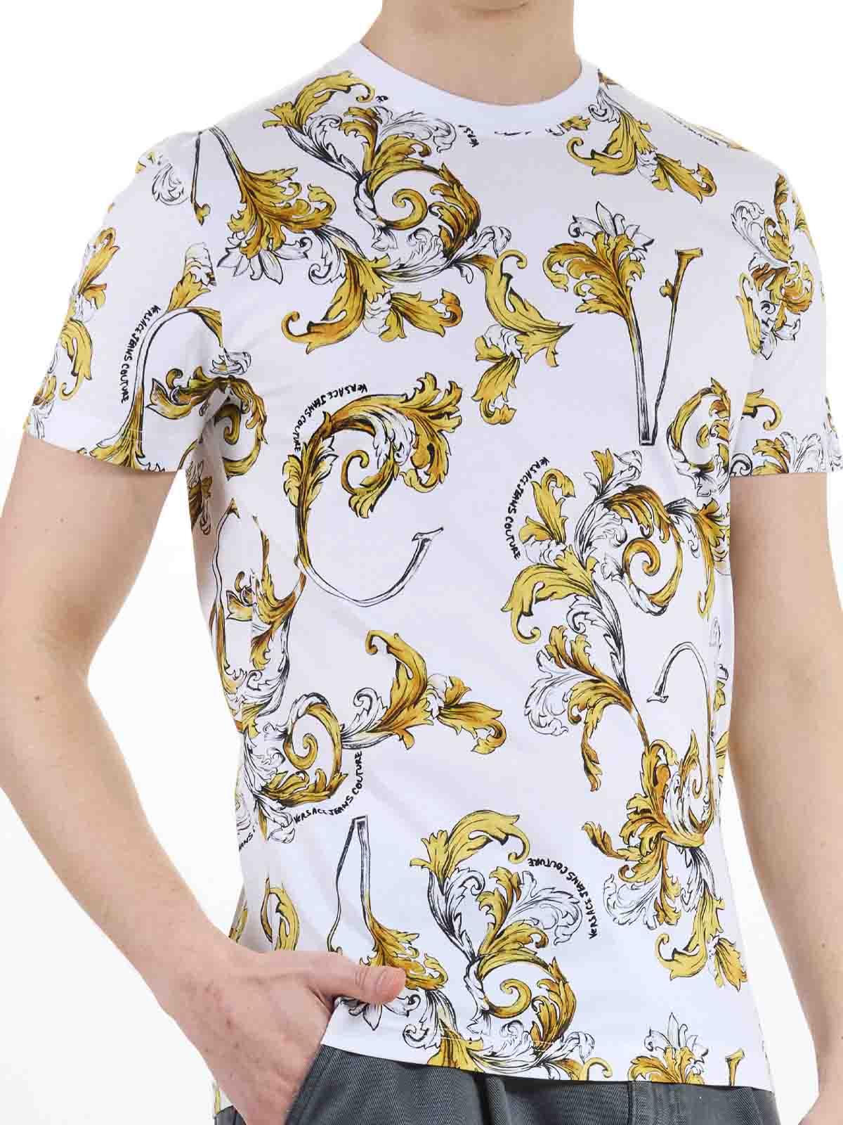 Camiseta barroca en color blanco, camisetas de manga corta con dobladillo con el característico estampado barroco de Versace en todas partes, manga corta, estampado barroco en todas partes, corte ajustado, multicolor