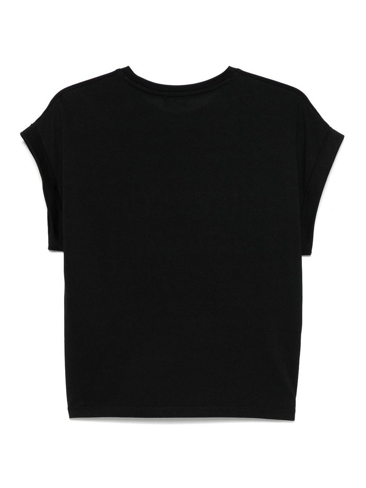 Cuello redondo negro, mangas cortas, puños dobladillos rectos